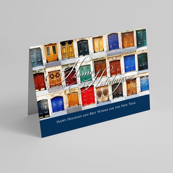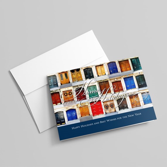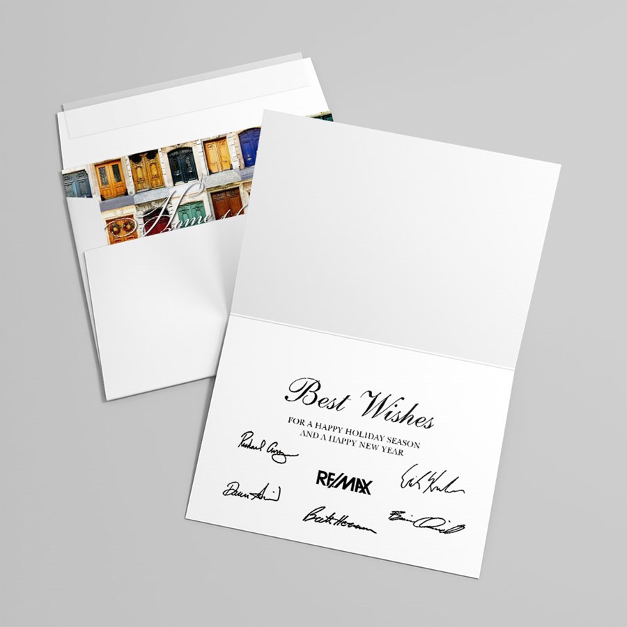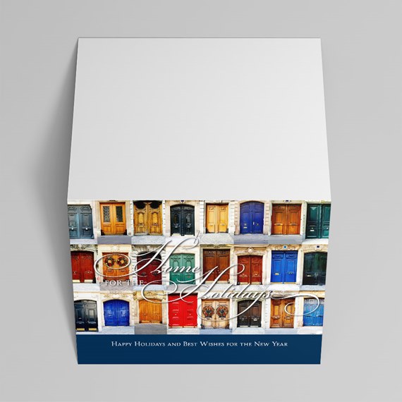 Fabulous front doors and architectural details are the hallmark of a beautiful home. Share this colorful real estate holiday greeting with all your customers and associates.