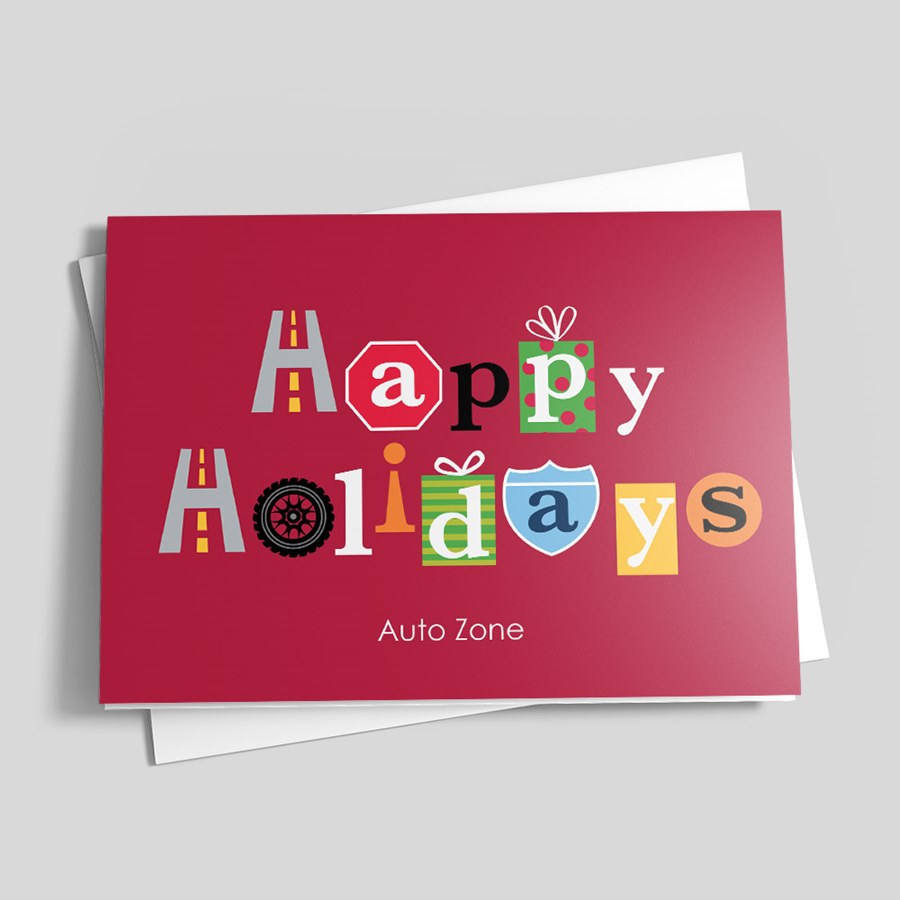 Deliver your good cheer and gratitude to your customers with a fun, yet professional Christmas card. This bright holiday greeting features colorful elements of the Trucking profession and your company name on a festive red background.