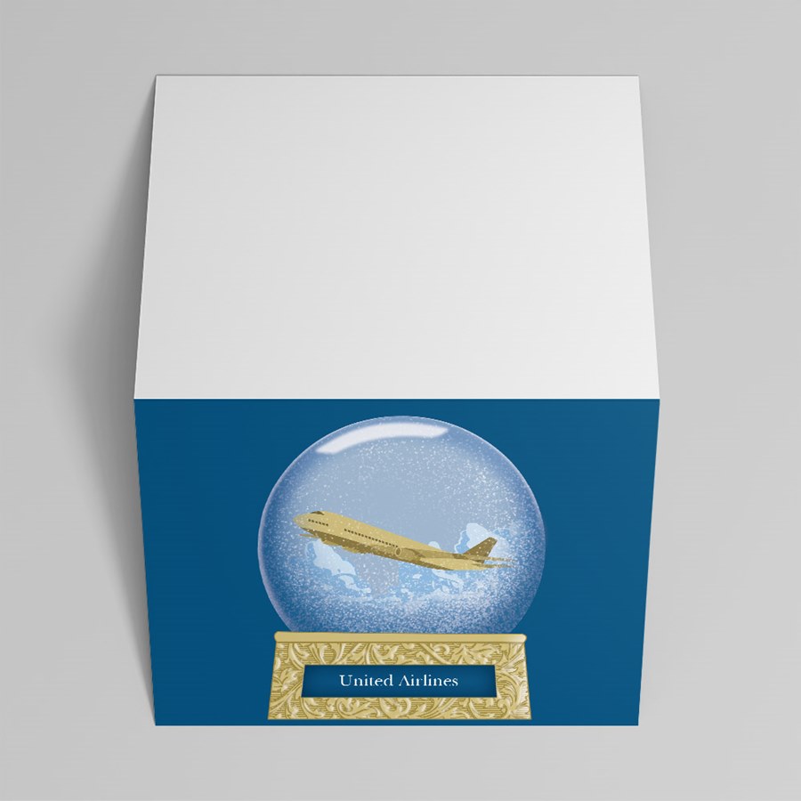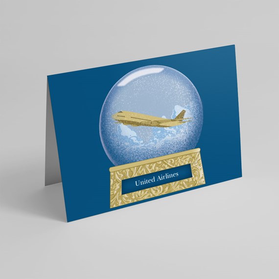 Whether they're in the business of flying or just fly a lot for business, your customers, associates and employees will appreciate this airplane-themed holiday card. The white, folding card features a snow globe design on a blue background.