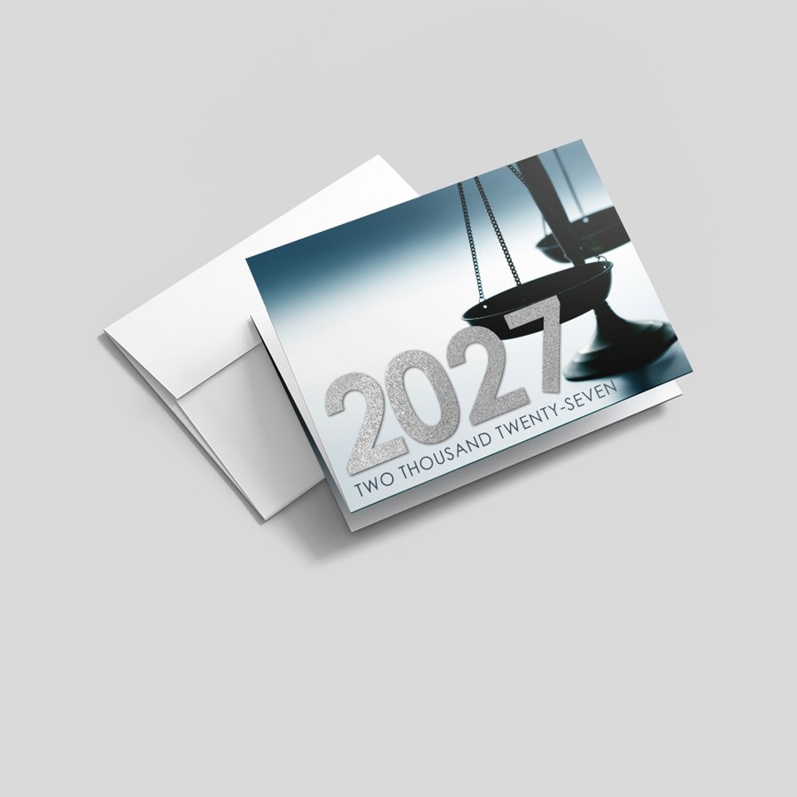 The year is shown in silver numbers and midnight blue letters at the top of this calendar card, featuring a black-colored scale of justice. Below, you'll see the days and months shown in silver, light blue, and white against a midnight blue background. Add your customizations at the bottom.