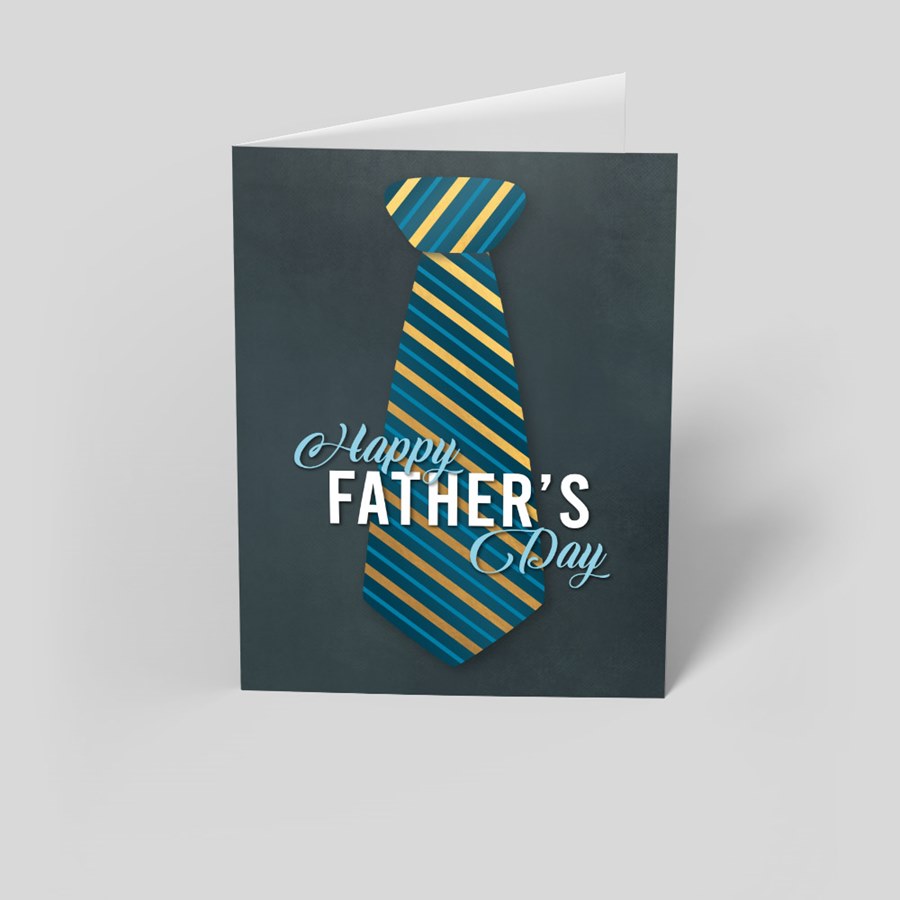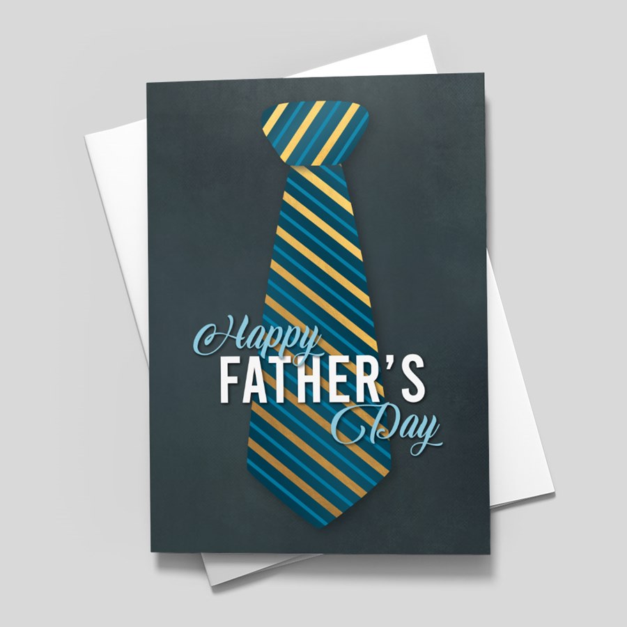 This Father's Day card celebrates the occasion with a message of 'Happy Father's Day' in stylish muted blue and white fonts. The design features a gold and blue diagonally-striped necktie included on a weathered slate gray background. The back of the card is gold. Choose from different paper types and sizes. Add your customizations.