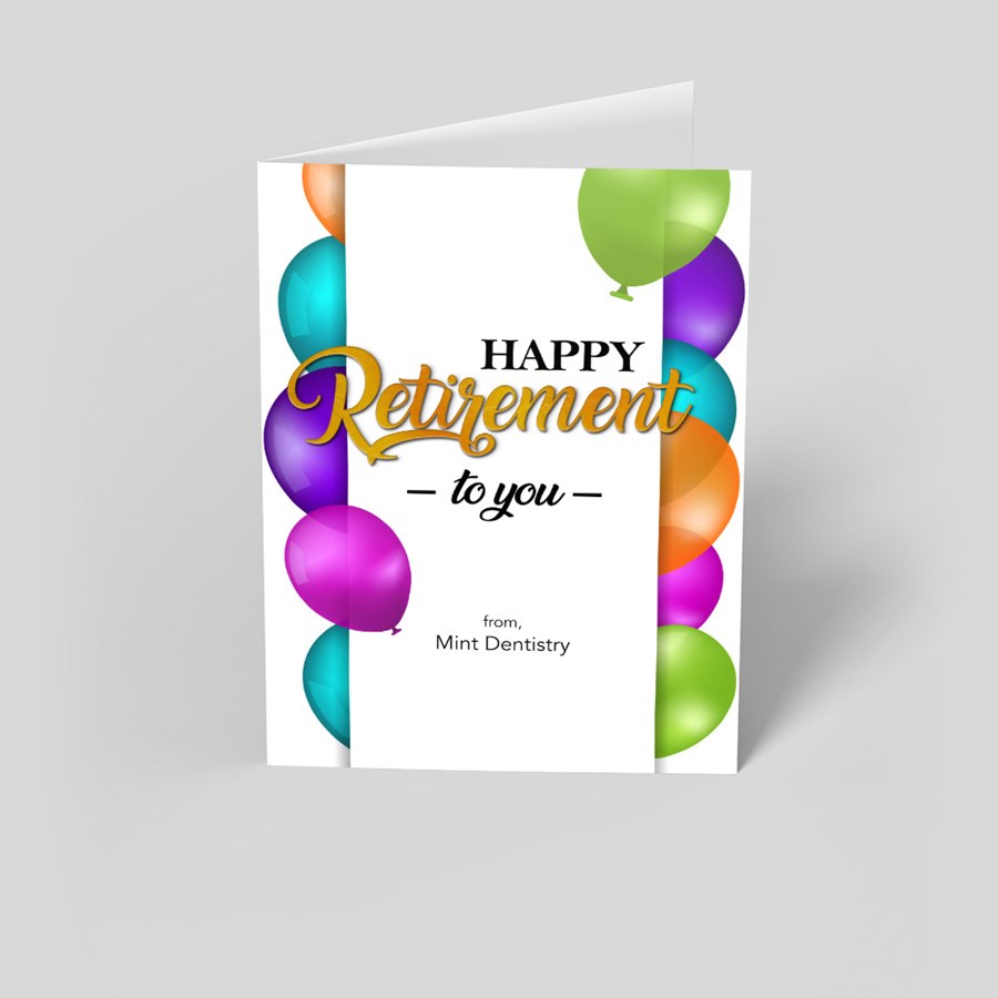 Festive, corporate-friendly design: colorful balloons frame a bold gold and black headline reading HAPPY Retirement with a smaller "to you" beneath for a celebratory, professional look. Space below is available for personalization.