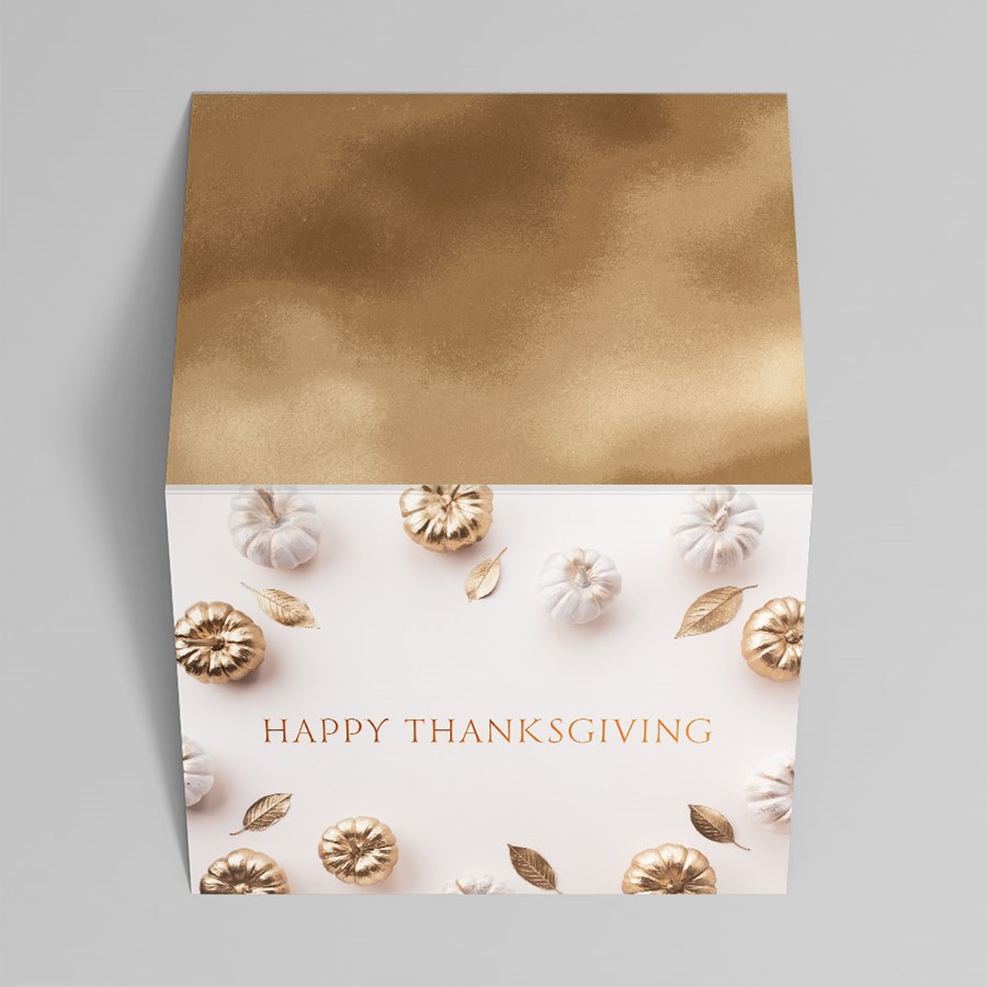 Elevate your holiday correspondence with a restrained, professional Thanksgiving card that balances seasonal warmth and corporate polish. The centered Happy Thanksgiving message is rendered in warm copper foil on a pale cream background for a subtle metallic sheen. Delicate white and gold mini pumpkins and metallic gold leaves frame the sentiment without overpowering it. Folded format arrives ready to send with a matching white envelope; printed on white cardstock for crisp detail and reliable handling. Designed for businesses and professionals, this card suits client and partner greetings, employee appreciation, executive notes, and controlled holiday mailings. Its minimalist pumpkin motif and refined foil finish convey gratitude while representing your organization with care.Trusted by businesses and professionals for over 50 years.
