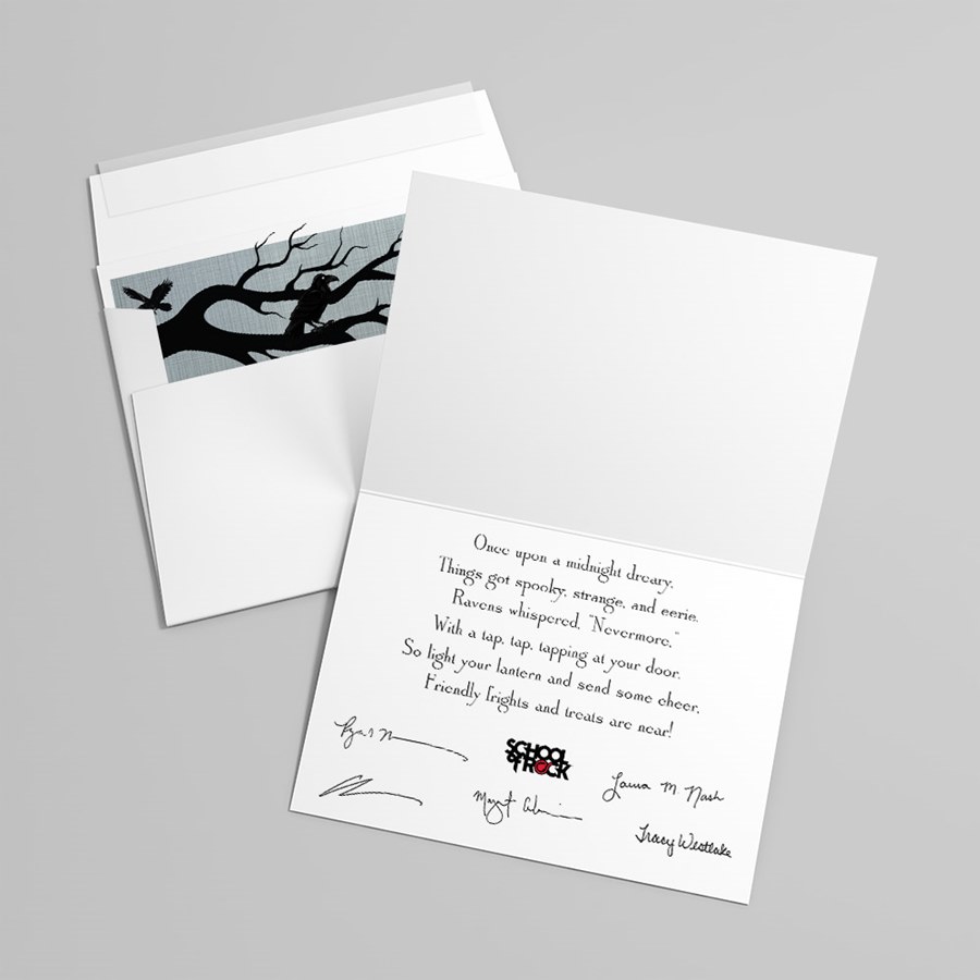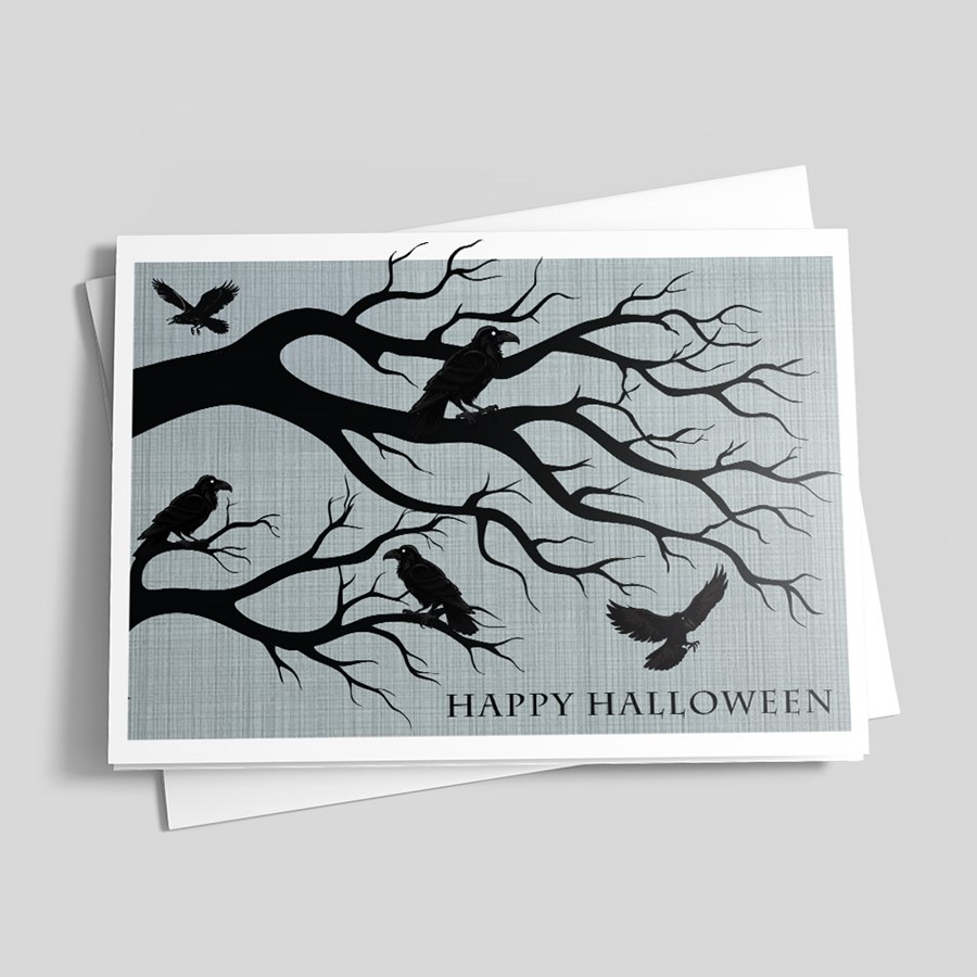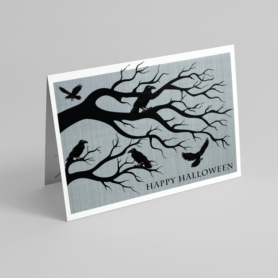 Raven Songs presents a restrained, sophisticated Halloween greeting: a textured light-gray background framed by an intricate black tree silhouette, with several black ravens perched along its bare branches. "HAPPY HALLOWEEN" is printed in bold black at the bottom of the front. Decorative printed accents—a short "midnight dreary" line, ornate signatures and a subtle logo placeholder—lend an editorial, curated look while keeping the overall tone professional and moody. Ideal for corporate seasonal mailings, client thank-yous, event invitations and office displays, this design delivers tasteful atmosphere without gimmickry. Shown with an envelope, it pairs well with branded stationery and seasonal packaging. From a company with over 50 years' experience in premium business greetings, Raven Songs fits client-facing communications that require refinement and character.Common Customer Questions