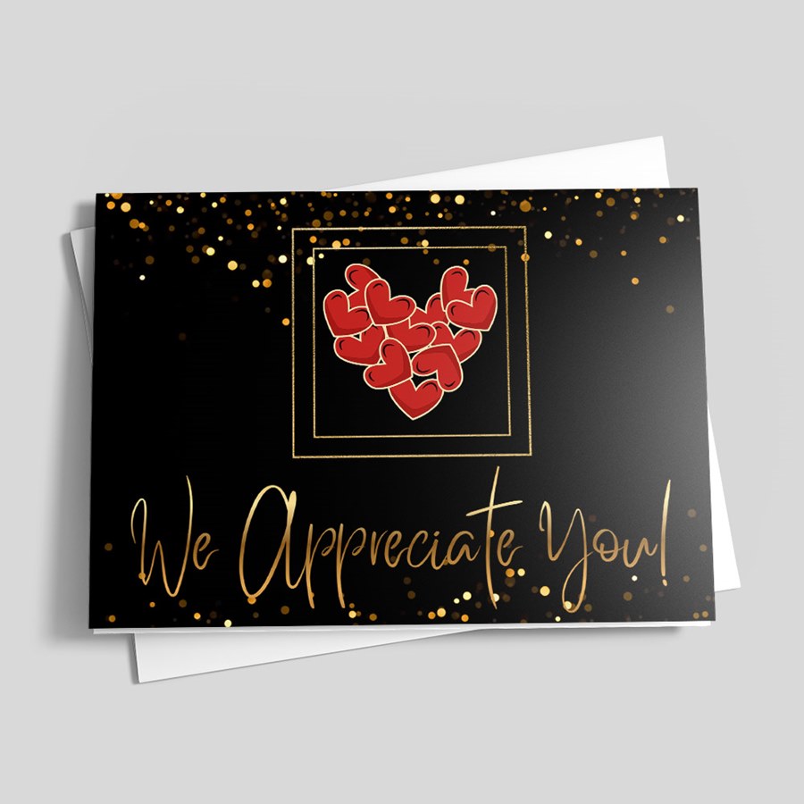 - Polished typography: The phrase 'We Appreciate You!' appears in a flowing gold cursive that contrasts crisply with the dark background for a premium, executive look.