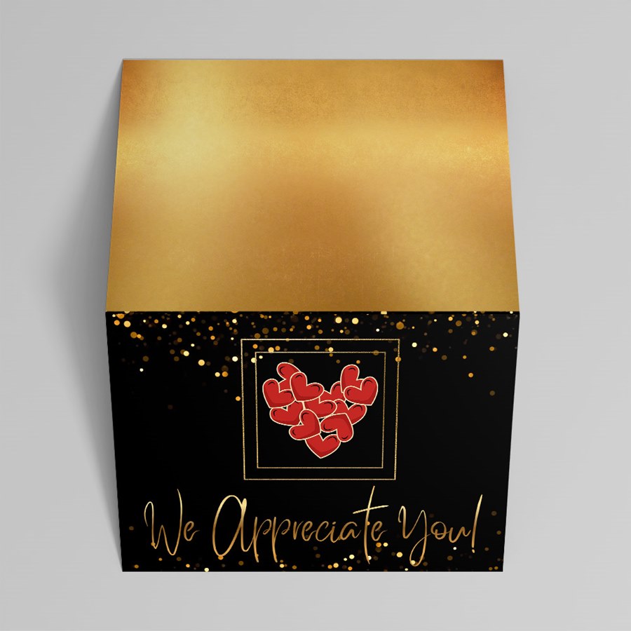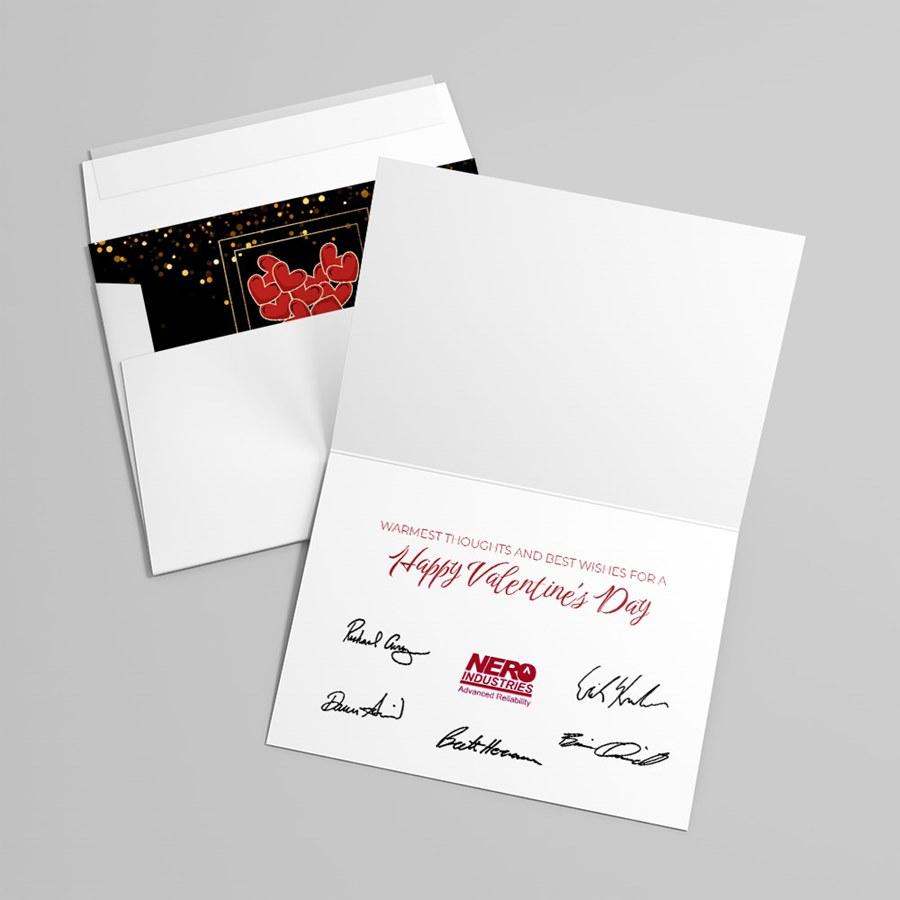 - Versatile interior options shown: Imagery includes both a black interior with gold accents and an example white interior printed with a Valentine’s message and signatures—suitable for client gifts, employee recognition, or elegant event stationery.