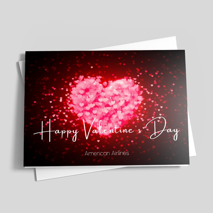 - Distinctive typography: "Happy Valentine’s Day" appears in a flowing white script, paired with a smaller sans-serif line beneath for company name or a discreet signature line (examples show corporate placement such as "American Airlines").