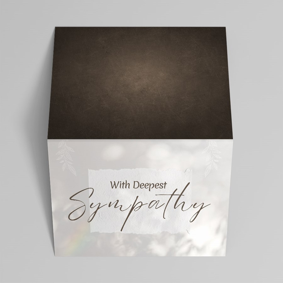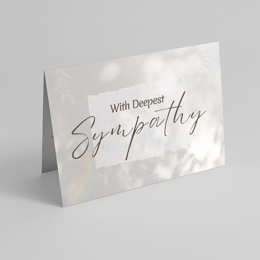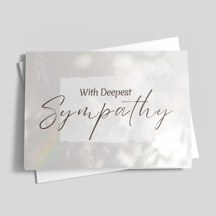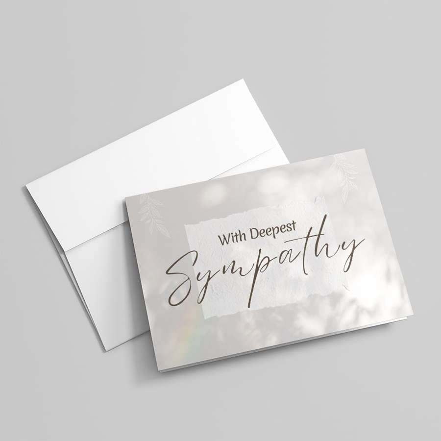 From an established leader in premium business greetings for over 50 years, the Gentle Words Sympathy Card offers an understated, professional expression of condolence. The cover features With Deepest Sympathy set in elegant cursive and serif lettering on a textured-looking white banner, framed by soft, blurred backgrounds, subtle leaf and floral motifs and a gentle rainbow accent. The muted palette and refined layout deliver a serene, respectful tone suitable for both personal and corporate use. This folded card opens to a pristine white interior ready to be personalized with your choice of verse, signatures or company logo—ideal for HR messages, executive condolences, client or vendor sympathies, and staff support. Your choice of lined or unlined coordinating envelopes are included.