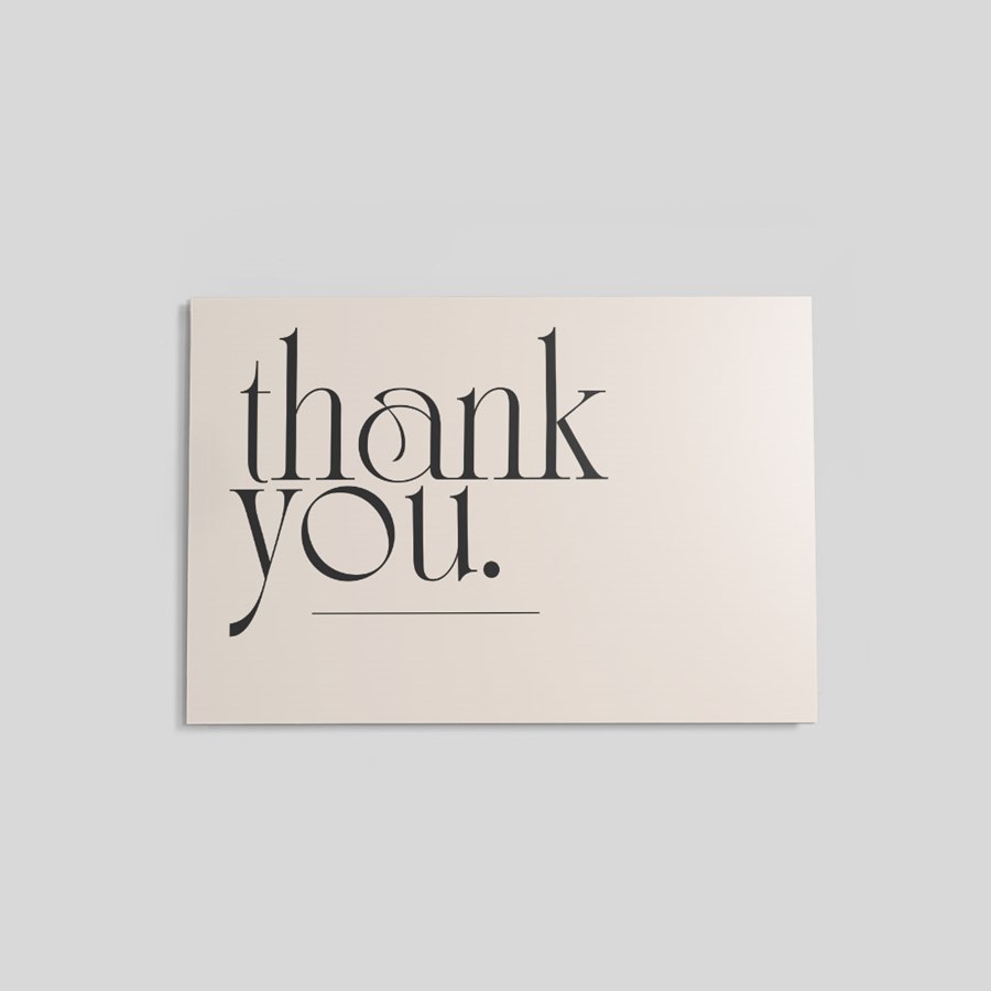 Convey professional gratitude with a clean, modern design. The front features the words thank you. in bold black typography on a soft beige field, anchored by a thin black horizontal line for a restrained, stylish look. A white-front option is available for personalization and the reverse is plain white for handwriting or addressing—making each card easy to customize without sacrificing a refined, business-appropriate appearance.