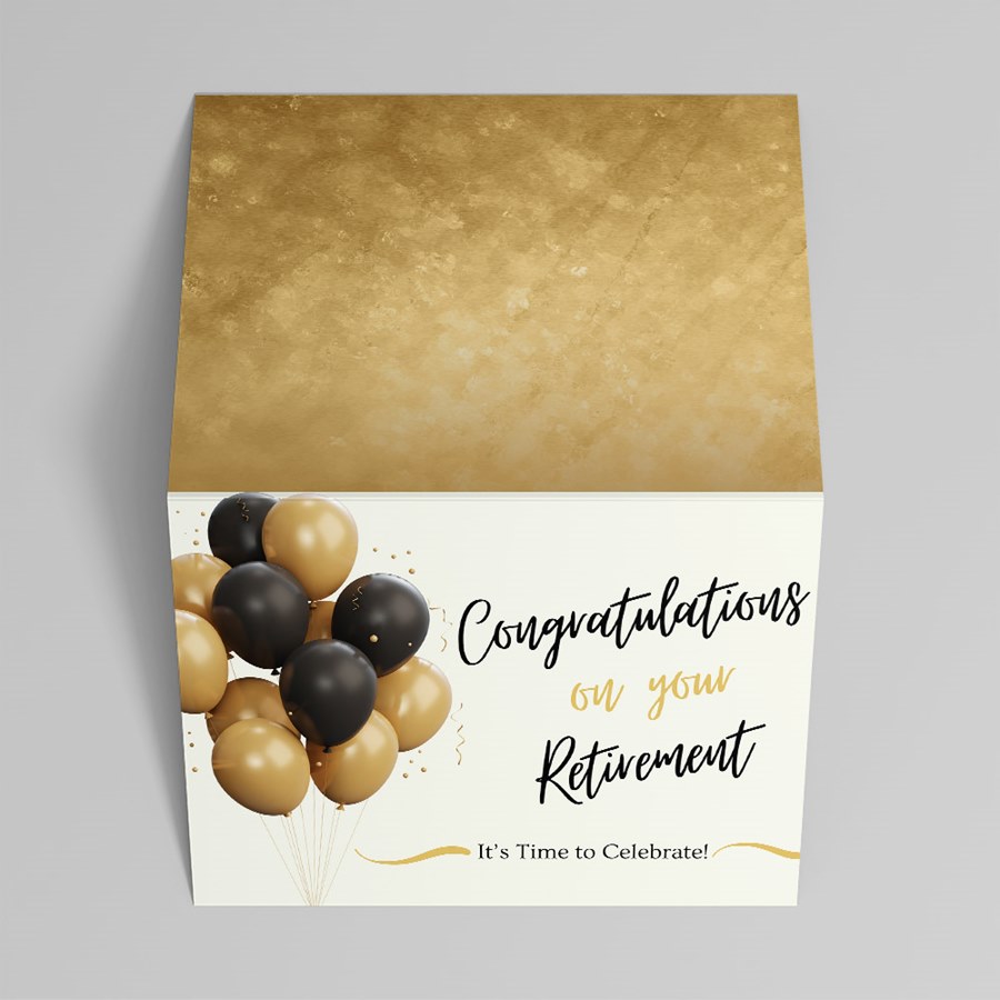 - Clear message: Prominent “Congratulations on your Retirement” rendered in a mix of script and serif fonts with a decorative swirl and the smaller phrase “It’s Time to Celebrate!”