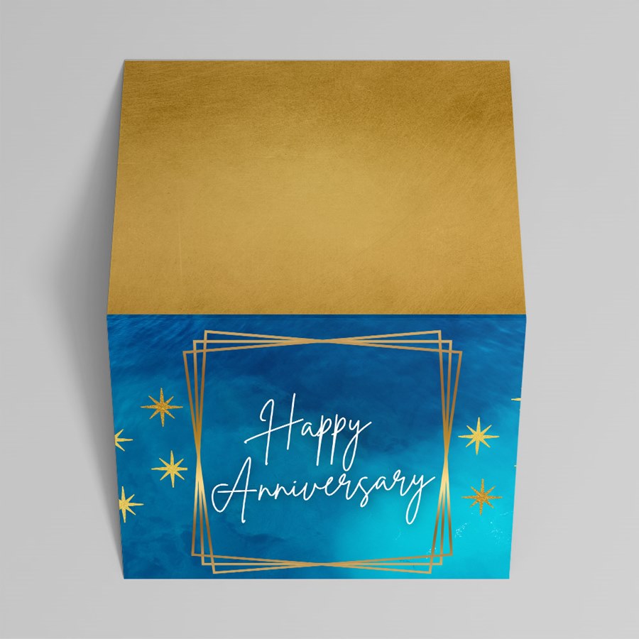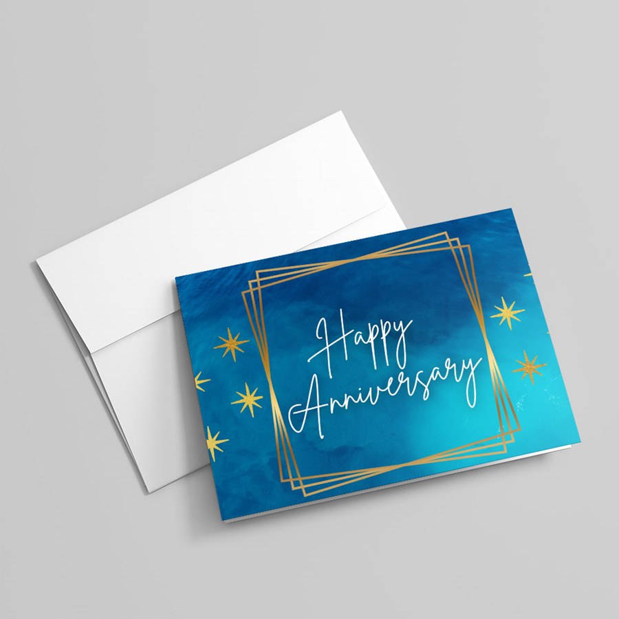 Celebrate milestones with refined, professional style. The front presents "Happy Anniversary" in flowing white cursive set against a blue watercolor-to-gradient background, encircled by a gold geometric frame and scattered gold star motifs. The composed design focuses attention on your message, delivering an elegant, understated look that suits both personal sentiment and corporate correspondence. Inside, a clean white interior is ready for your custom verse, signatures and/or logo, making this card ideal for client anniversaries, employee service awards, partner milestones, executive greetings, and VIP gift enclosures.