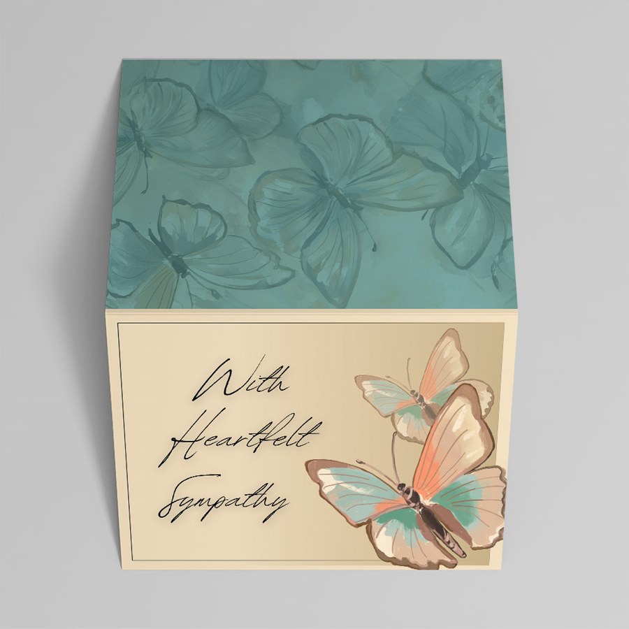 - Two illustrated butterflies in soft pastel blue and peach provide a gentle, comforting focal point that conveys warmth and solace.