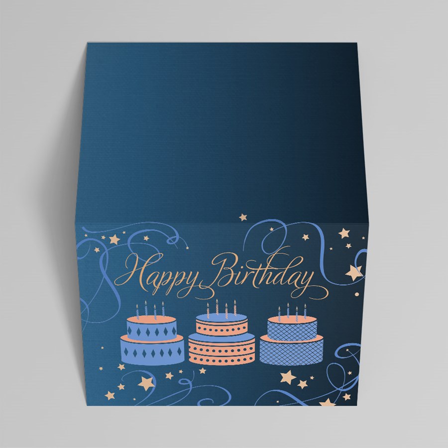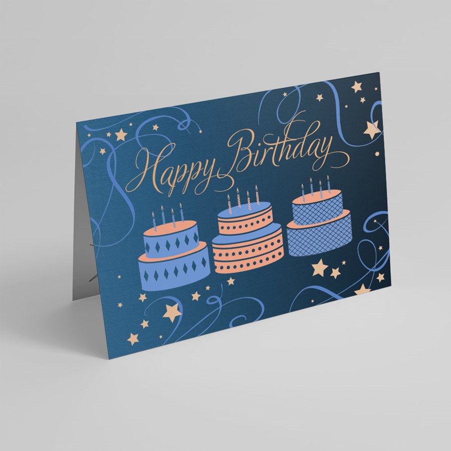 - ‘Happy Birthday’ is elegantly scripted in a warm peach tone, balanced by lighter blue and peach swirls and small stars for a celebratory finish.