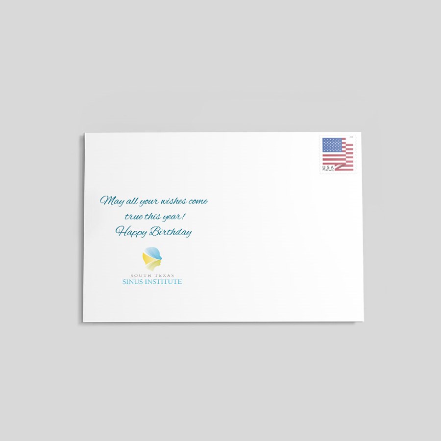 Refined, customizable birthday greeting in calming blue and teal tones This elegant card features a light blue-to-teal palette with a central teal rectangle bearing "Happy Birthday" in flowing white cursive, surrounded by playful party hats in varying blue and green shades—some striped, some dotted—for a polished yet cheerful look. The printed design presents clean contrast and professional appeal, ideal for corporate correspondence and upscale personal greetings.
