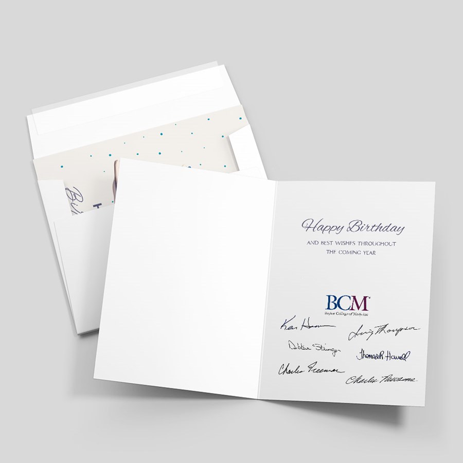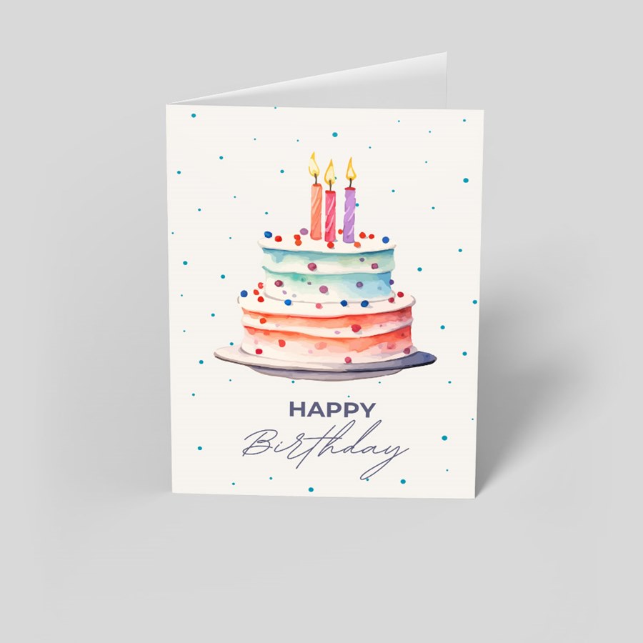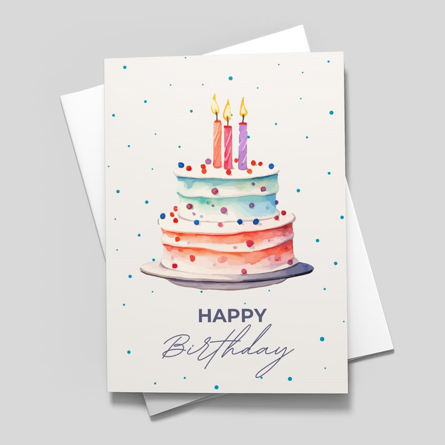 A bright, professional greeting that balances charm with a polished look. The front features a multi-tiered, pastel cake—pink, blue and white layers—topped with three candles and surrounded by colorful confetti dots. The elegant "HAPPY Birthday" sentiment sits beneath the illustration on a clean white field, making the design instantly legible and appropriate for both personal and corporate celebrations. The folded card presents a crisp blank interior, ready for handwriting or inked personalization. Your choice of coordinating lined or unlined envelopes are included.