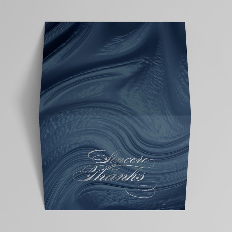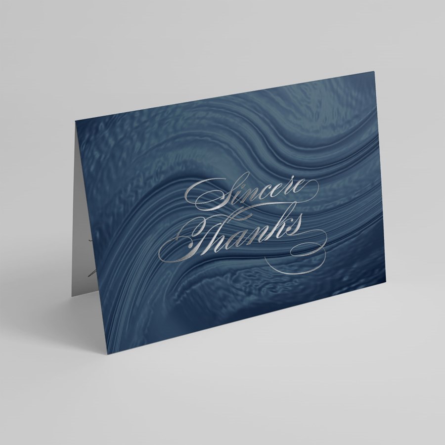 This folded, professionally printed thank you card pairs a flowing navy-blue design with elegant silver script to deliver a message of sincere appreciation with polished style. The eye-catching front features a smooth, swirling blue background accented by the words “Sincere Thanks” printed in a silver foil. The classic folded format provides ample space inside for a personal handwritten note or a printed message, making it easy to customize for any occasion. Your choice of coordinating envelopes are included.