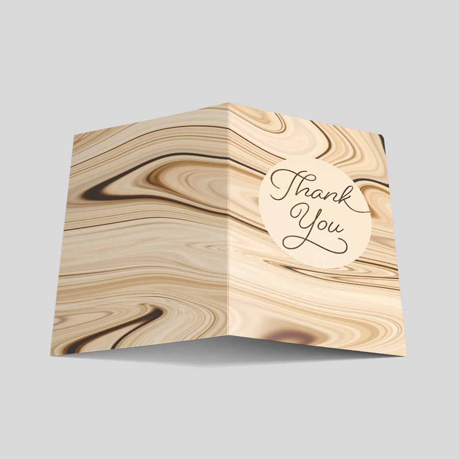 The Beige Marble Thank You Card presents a refined marble motif in swirling beige, cream and light-brown tones for a warm, understated look suited to professional correspondence. A centered circular beige woodgrain panel features the message 'Thank You' in graceful brown cursive script, offering immediate, elegant impact without distraction. A clean white interior is ready for your own customization and your choice of envelopes are included.