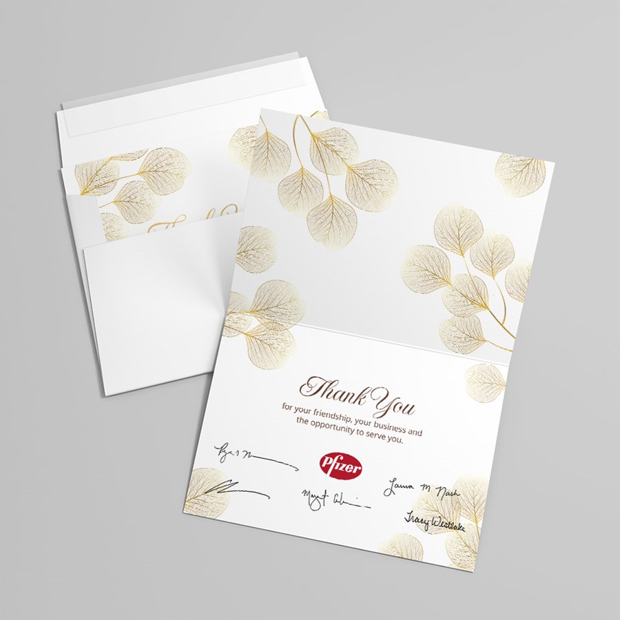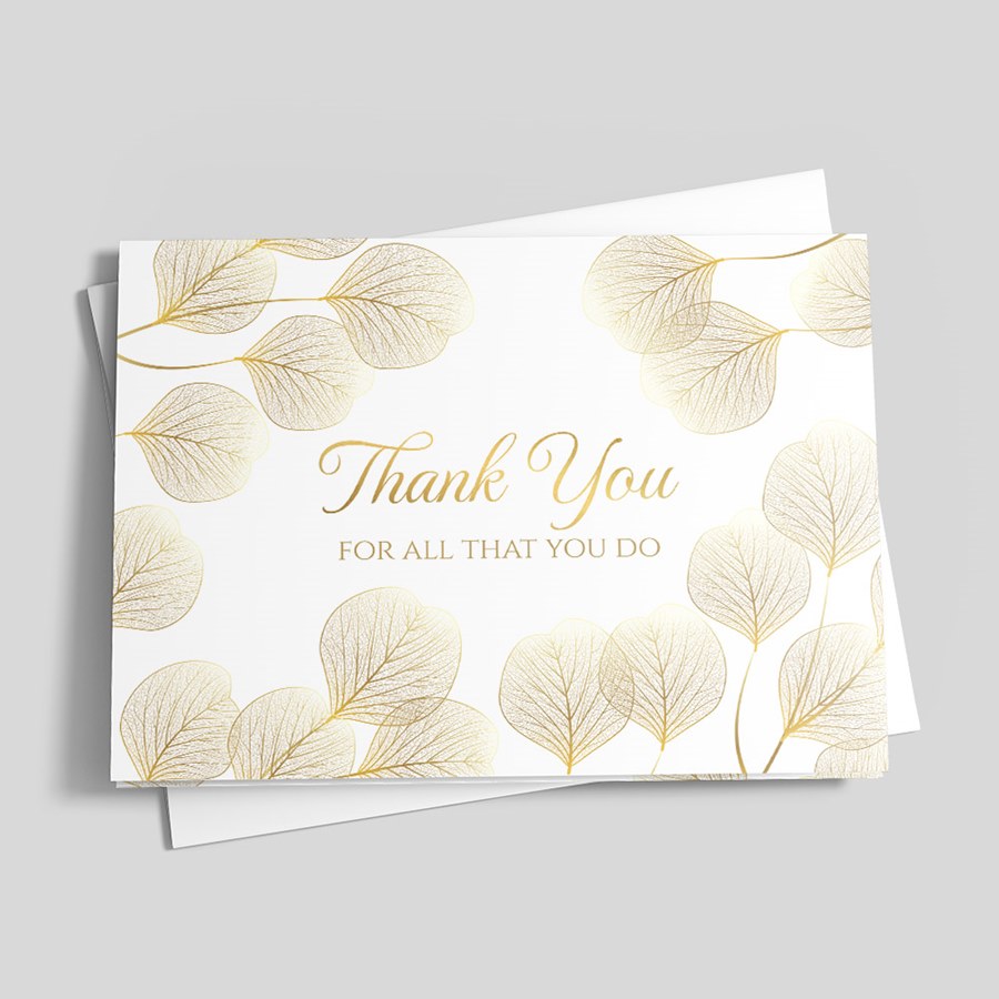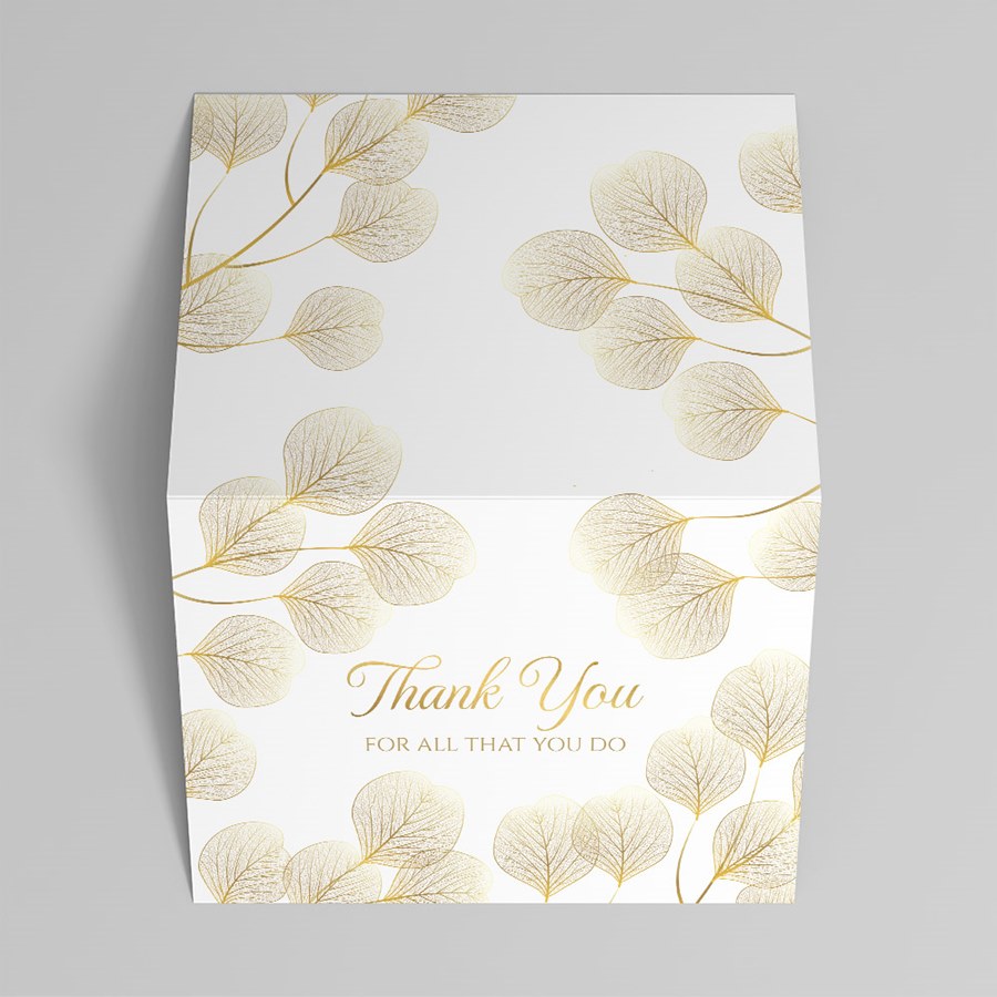 Elegant and understated, this folded thank you card pairs a clean white background with delicate gold-tinged leaf motifs that frame the front, keeping the focus on your message. The center features refined script reading “Thank You,” with the phrase “for all that you do” set below in warm brown type for a timeless, polished presentation. Subtle metallic accents lend an elevated, heartfelt tone without overwhelming your sentiment. The blank interior provides ample space for a personalized verse, signatures, and a logo.