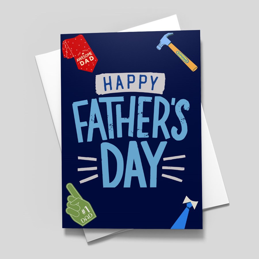 This folded Father’s Day card features a bold navy cover with large light-blue “Happy Father’s Day” typography that reads clearly at a glance. Playful yet professionally rendered graphics—including a red “Awesome Dad” tag, yellow hammer, green “#1 Dad” foam finger, and blue necktie—add cheerful personality without appearing juvenile. The white interior provides ample space for a custom verse, company logo, and multiple signatures, making it ideal for team appreciations and corporate gifting.