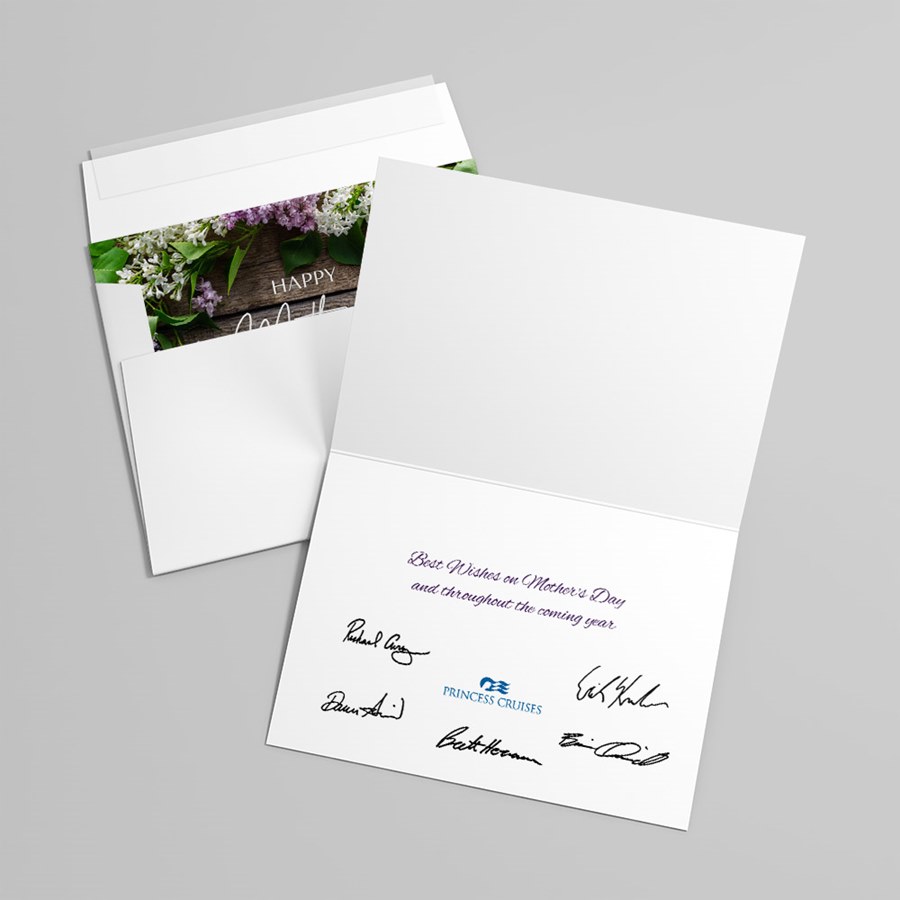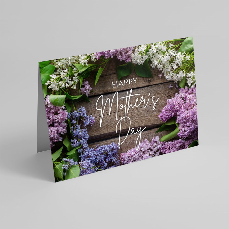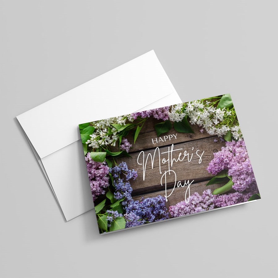 Elegant and understated, this folded Mother’s Day card pairs soft botanicals with a refined, professional layout. The front features a delicate border of lilac and white flowers with green leaves set against a warm wooden background, centered by “Happy Mother’s Day” in graceful cursive script. The white interior is fully customizable, and your choice of coordinating envelopes is included.