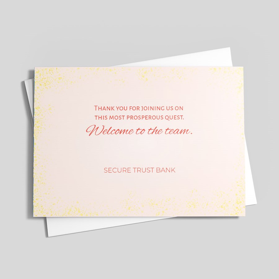 This greeting card features a vibrant sunburst design with alternating rays in orange, yellow, and light blue, framing playful white “Welcome” typography set against a soft pink background with subtle yellow speckled edges. The cheerful color palette creates an inviting, energetic look that feels fresh and professional. Your custom personalization can be added in your choice of ink, and coordinating envelopes are included for a polished presentation.