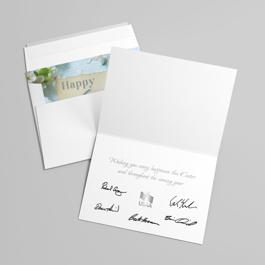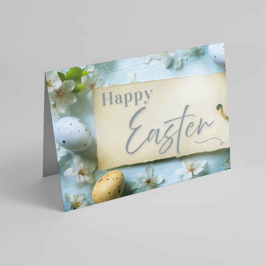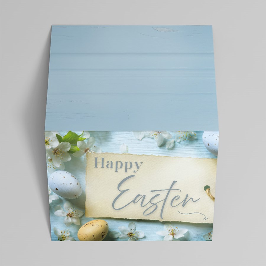 This folded Easter greeting card features a refined spring design with a light blue wood-texture background accented by white blossoms and pastel speckled eggs for a tasteful seasonal statement. The front showcases a textured beige tag printed with “Happy Easter” in elegant gray cursive, styled with a torn-paper look and subtle twine loop for handcrafted appeal. Inside, the crisp white interior is open for personalization, allowing space for your message, logo, and signatures.