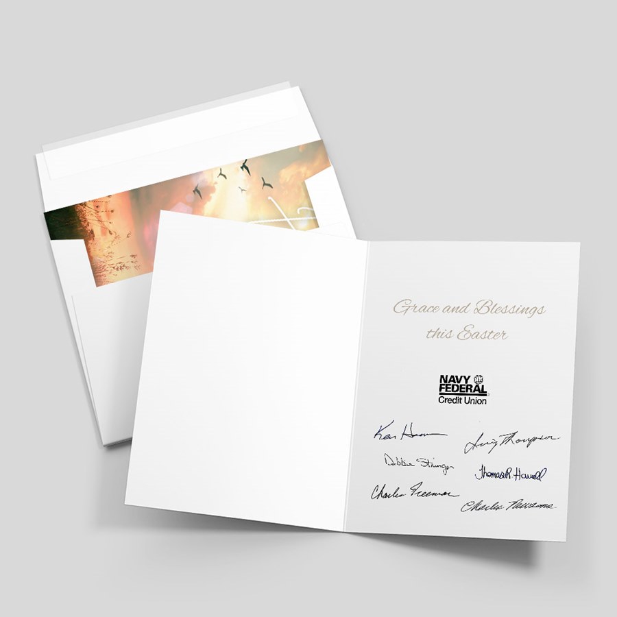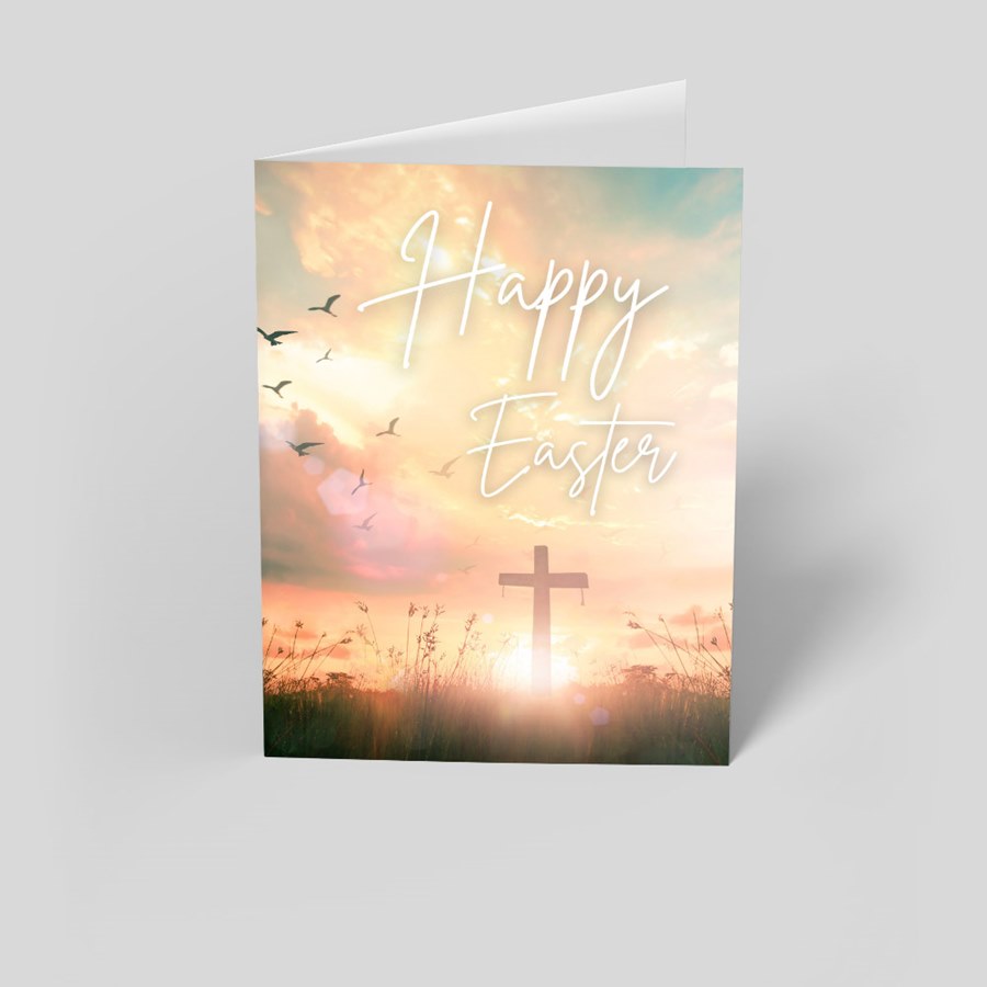 This folded Easter card offers a reverent, professional way to send seasonal wishes. The front presents a cross silhouetted against a pastel sunset sky with soft clouds and birds in flight, accented by the words “Happy Easter” in flowing script. The card opens to a crisp white interior ready for a personalized verse, logo, and signatures.