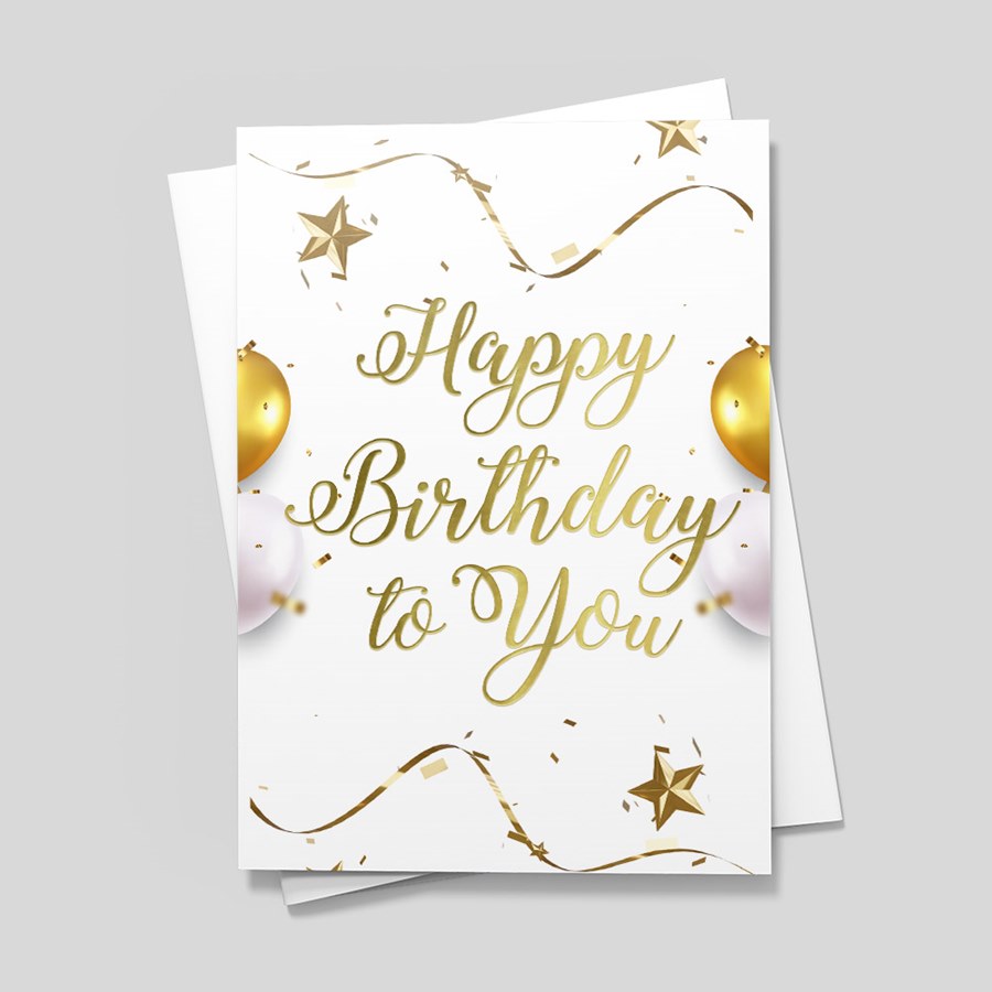 This refined birthday card pairs elegant simplicity with celebratory flair, featuring “Happy Birthday to You” in foil script on a crisp white background accented by gold stars, confetti, and gold-and-pink balloons. The foil color can be customized to complement your brand or occasion, while the formal layout and subtle swirls maintain a polished, professional tone. The interior is ready for your personalized text, verse, company logo, and signatures, making it ideal for client appreciation, employee milestones, executive notes, and upscale events. Coordinating envelopes are included for a cohesive, ready-to-send presentation suitable for individual greetings or bulk corporate orders.