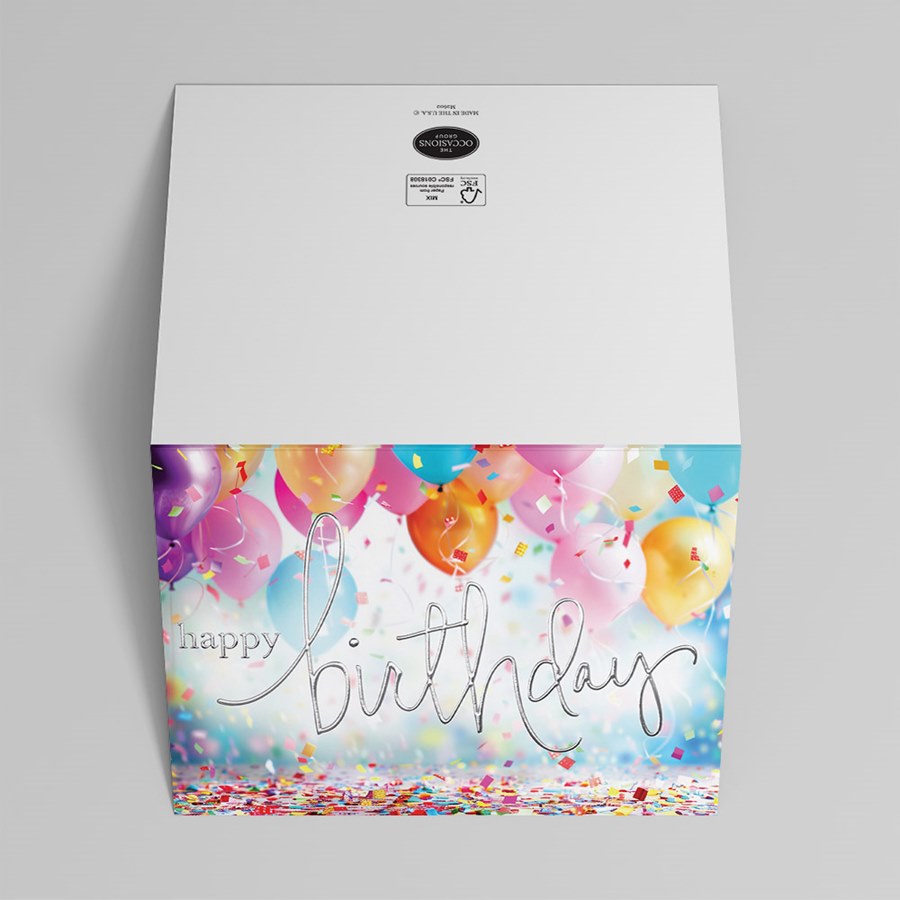 A display of "happy birthday" is elegantly written in flowing silver foil script across a confetti-sprinkled field of multicolored balloons, creating a festive yet refined look that’s ideal for business celebrations. The white interior provides a clean space for your personalized verse, logo, or signatures in ink or foil, and each card includes coordinated envelopes for a polished, professional presentation.