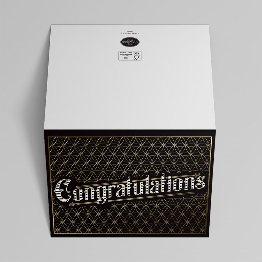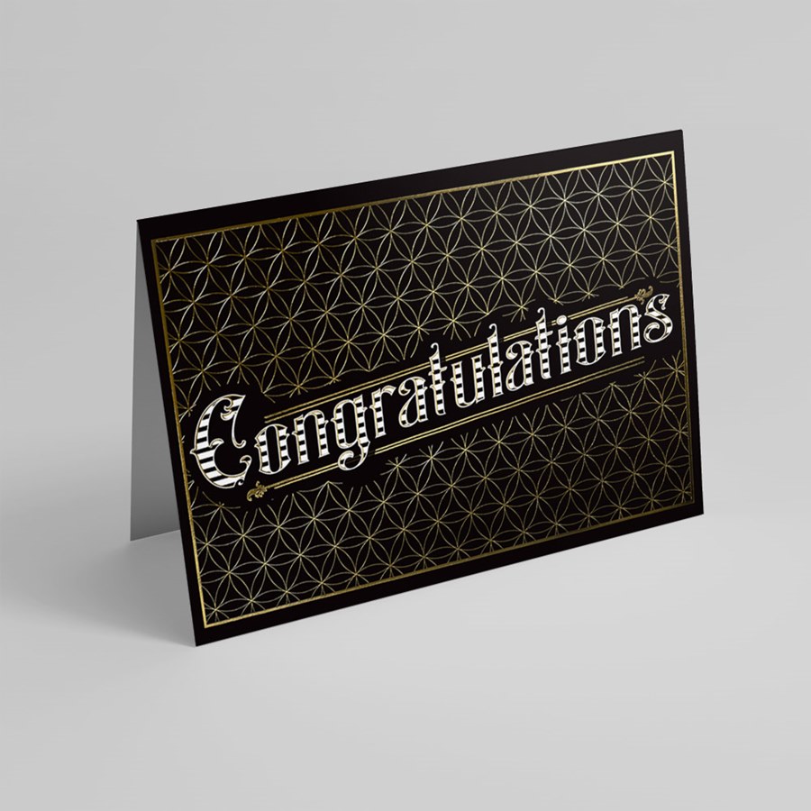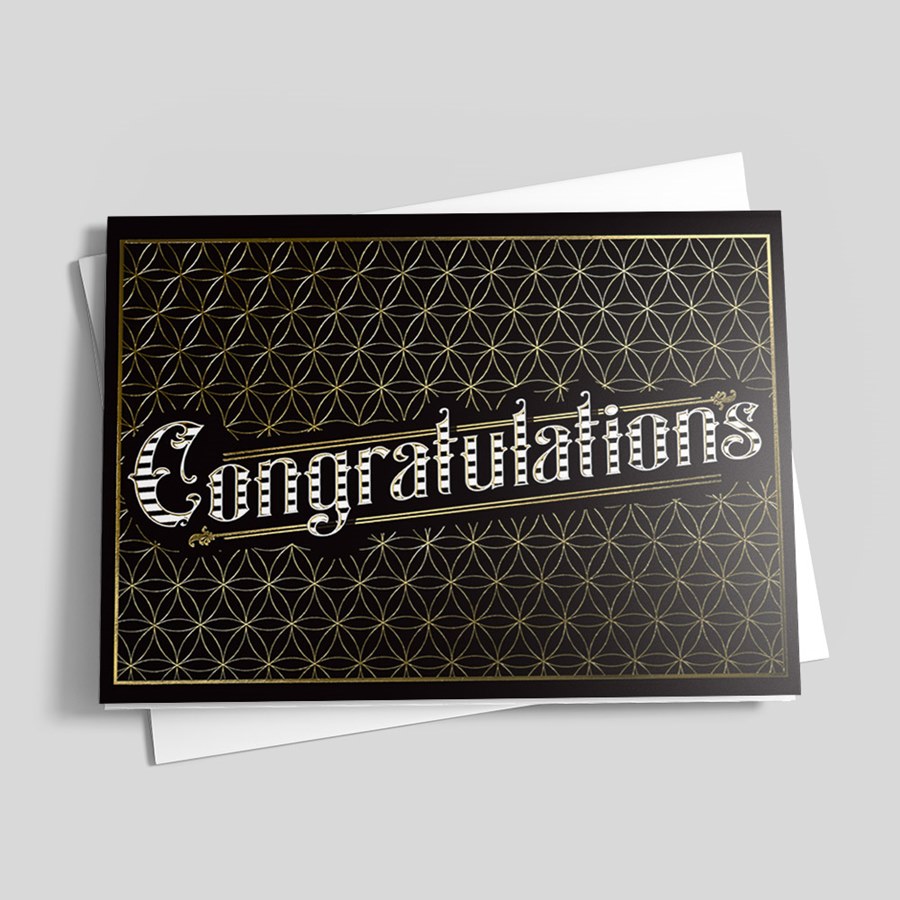 Congratulations is boldly presented in stylized white lettering on a deep black background with a geometric gold pattern and thin gold border, creating a professional and elegant impact. The crisp white interior offers a refined space for your personalized message, verse, logo, or signatures, and each card includes coordinated envelopes for a polished, consistent presentation.