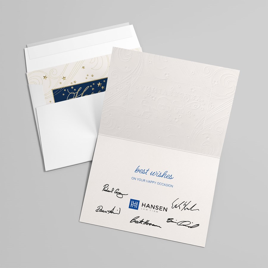 Happy ANNIVERSARY is elegantly displayed in gold foil—script for "Happy" and bold capitals for "ANNIVERSARY"—on a deep navy panel, set against an ecru background with swirling gold lines and scattered stars for a refined, celebratory look. The ecru interior offers a clean space for your custom verse, company logo, or signatures in ink or foil, and each card includes coordinated envelopes for a polished, professional presentation.