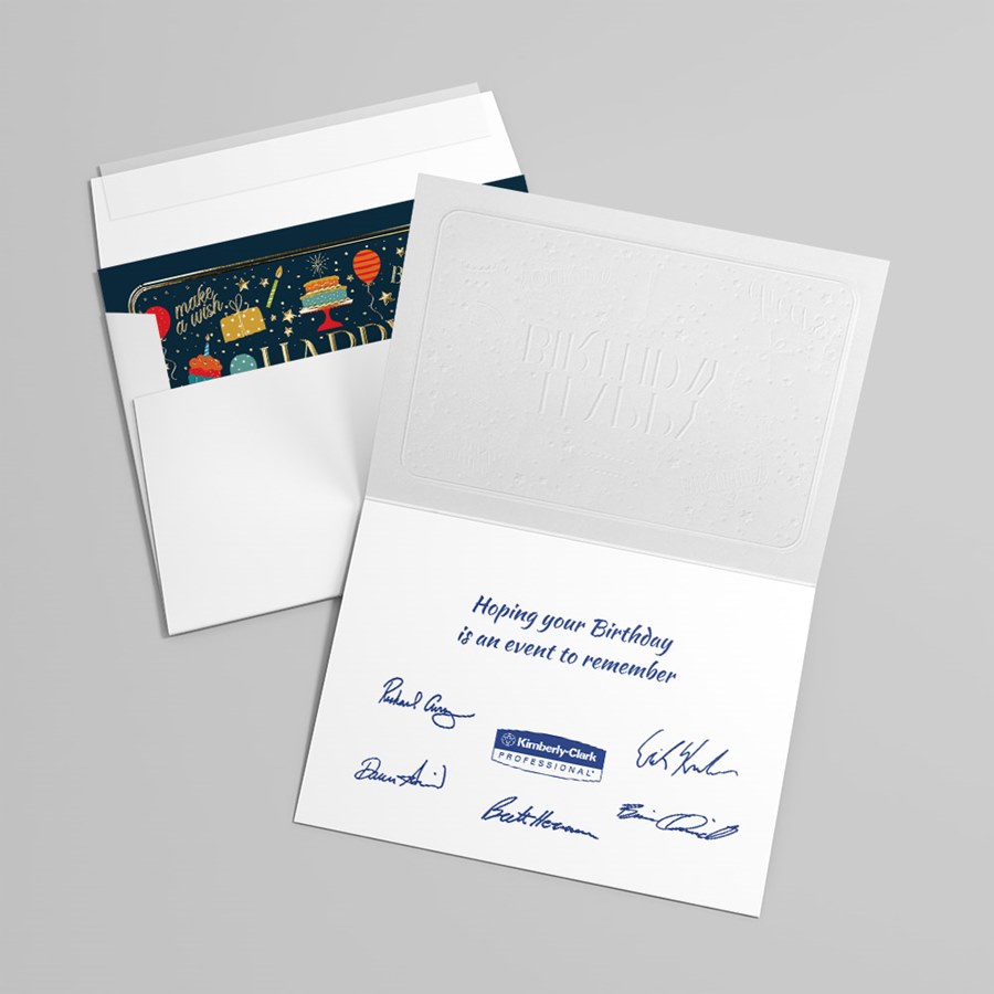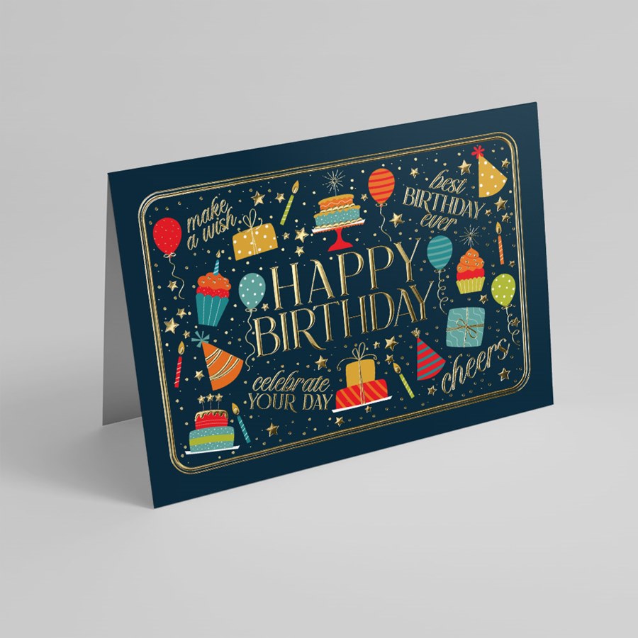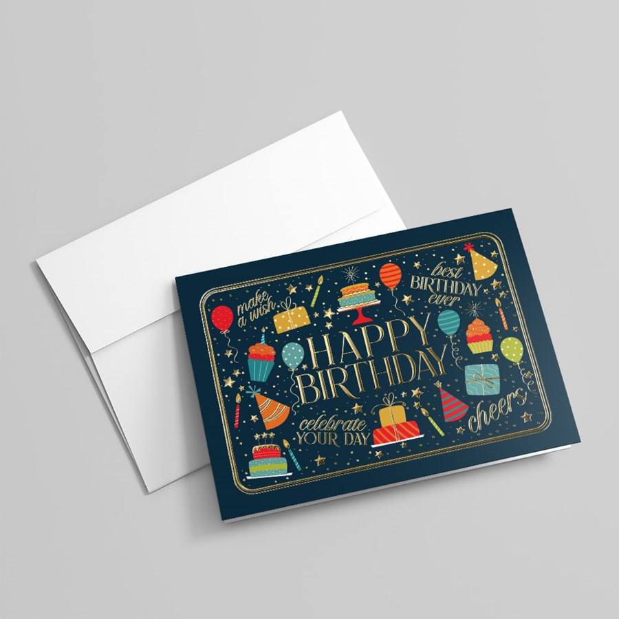 Make every birthday memorable with a vibrant navy card featuring gold foil "Happy Birthday" lettering, playful illustrations, and celebratory phrases, perfect for professional gifting to clients or colleagues. Personalize the interior with your company logo, verse, or printed text, and select your preferred foil or ink color for a tailored touch. Coordinated envelopes are included for a polished, ready-to-send presentation.