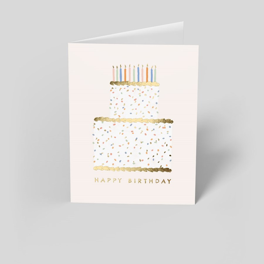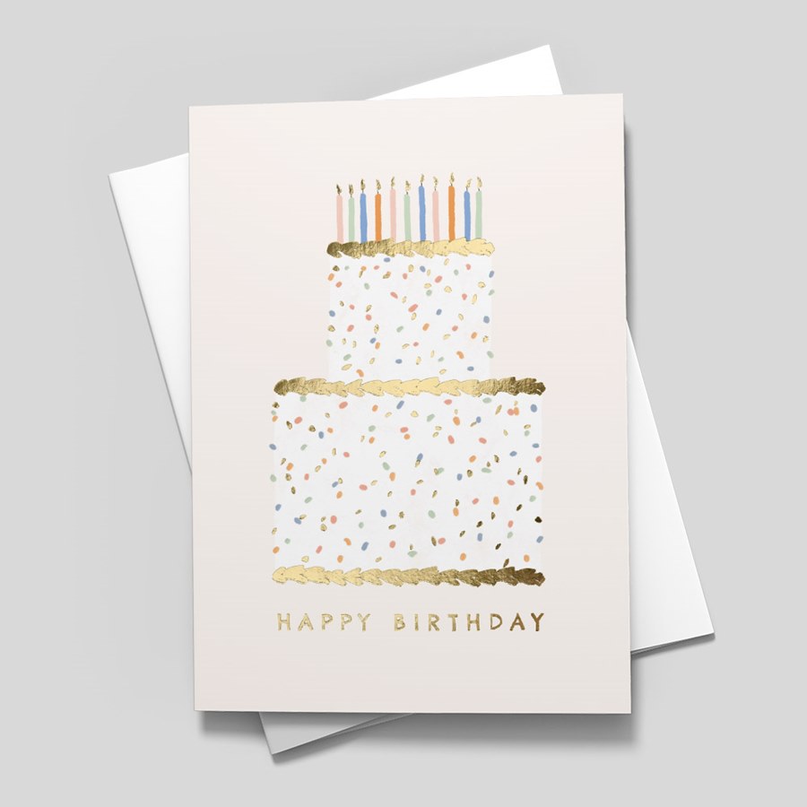 Brighten birthdays with a cheerful two-tier cake adorned in colorful sprinkles and pastel candles, finished with gold foil "Happy Birthday" lettering and subtle gold accents for a polished, professional look. The solid white interior is ready for your personalized verse, logo, or signatures in ink or foil, making it ideal for client milestones, executive birthdays, or employee recognition. Coordinated envelopes are included for a seamless, ready-to-send presentation.