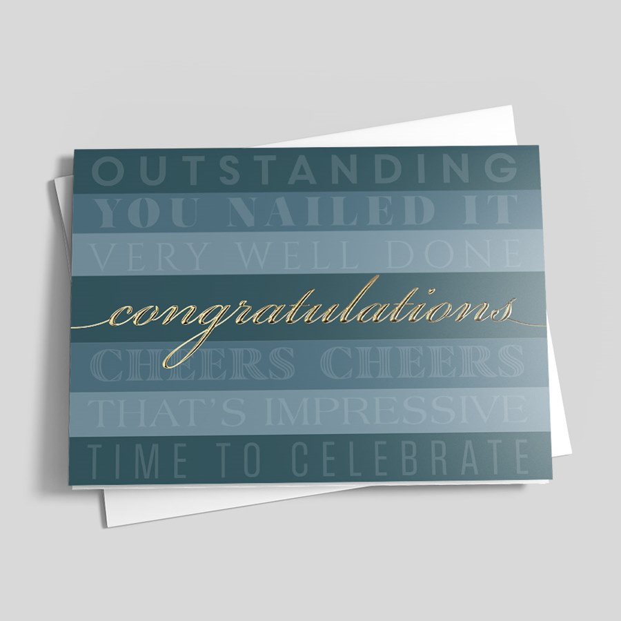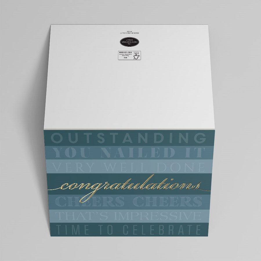 Celebrate achievements with a modern, layered design featuring bold blue and gray typography and a prominent gold script of "Congratulations", perfect for promotions, awards, and team milestones. The spacious interior accommodates group signatures or personalized messages, making it ideal for corporate recognition and departmental gifts. Coordinated envelopes are included for a polished, professional presentation.