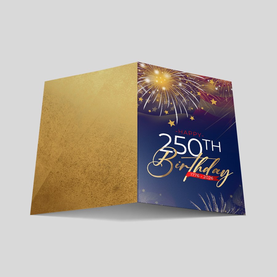 Celebrate America’s 250th with a distinguished commemorative card featuring a deep navy front panel adorned with gold fireworks, stars, and “HAPPY 250TH Birthday” lettering accented in red and white, plus a tasteful 1776–2026 caption. The golden textured reverse adds warmth, while the crisp white interior is ready for your personalized verse, logo, or signatures—perfect for corporate commemorations, milestone mailings, or formal invitations. Coordinated envelopes are included, ensuring a polished and memorable presentation for your organization