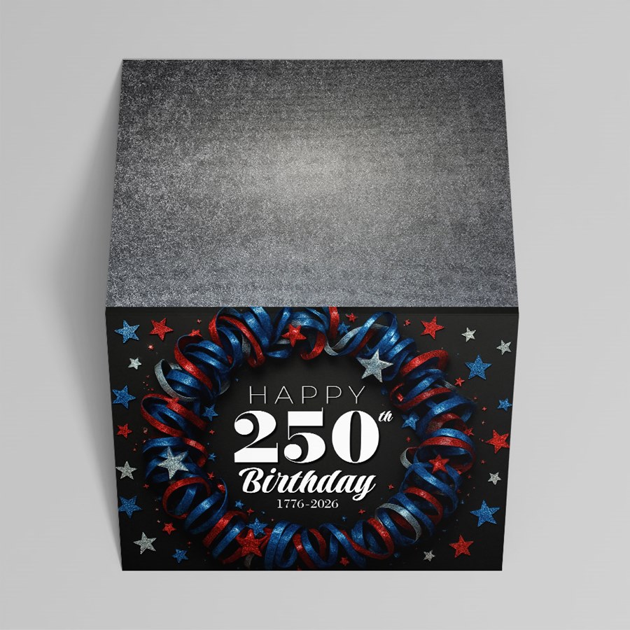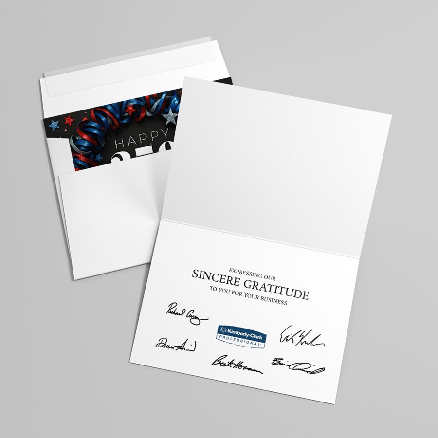 HAPPY 250th Birthday is elegantly displayed on a striking black cover, surrounded by a circular arrangement of red, blue, and silver ribbons and stars for a memorable corporate tribute; the years 1776–2026 are featured beneath, making this card ideal for commemorative mailings, patriotic events, and professional celebrations. The solid white interior is ready for your personalized message, logo, or signatures, and each card includes coordinated envelopes for a polished presentation.