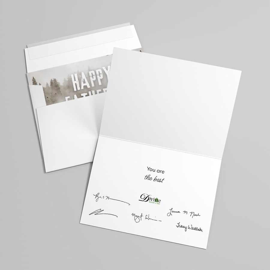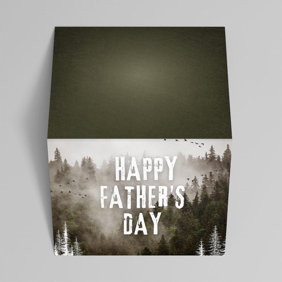A misty woodland scene with tall trees and gentle fog sets a calm, contemporary tone, while the front boldly states HAPPY FATHER'S DAY in large, distressed white letters for immediate impact and clarity. Subtle white tree silhouettes and birds add handcrafted depth, complemented by a refined deep green palette; the clean white interior is ready for your personalized verse, logo, or signatures. Coordinated envelopes are included, making this card ideal for client gifts, employee recognition, or tasteful corporate mailings.