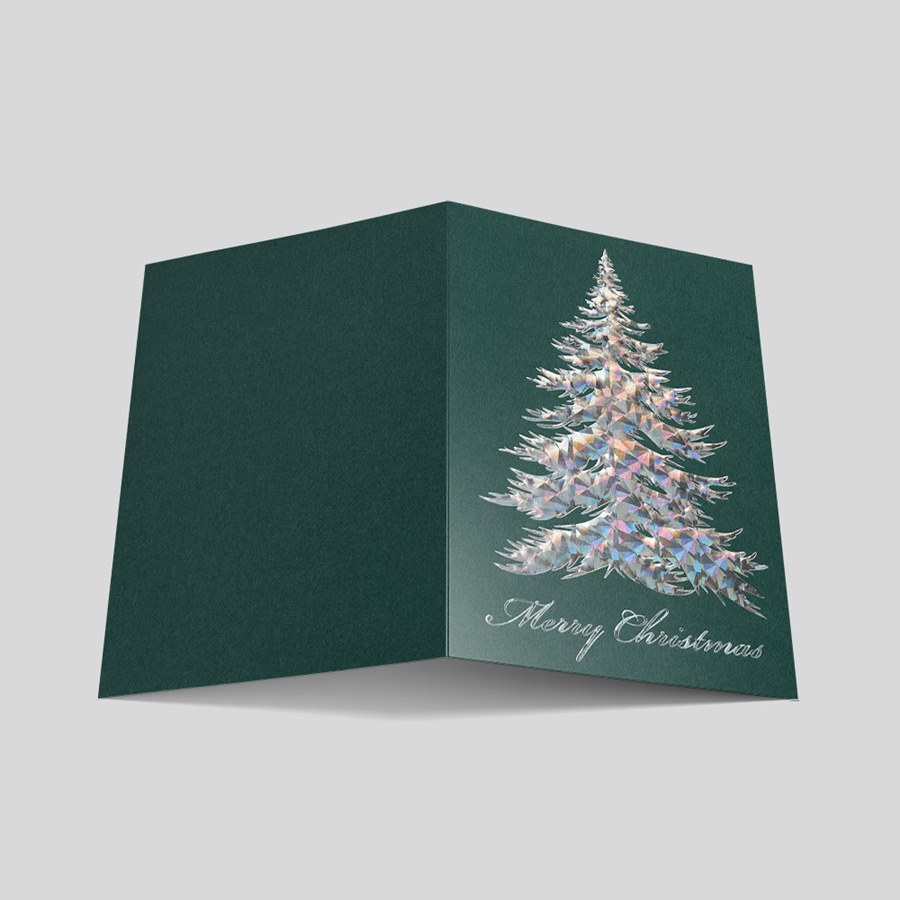 Make your holiday message memorable with a modern card featuring a geometric Christmas tree in silver holographic foil and embossed details on a rich dark green background, with "Merry Christmas" elegantly scripted in matching silver foil at the bottom. Coordinating envelopes are included.