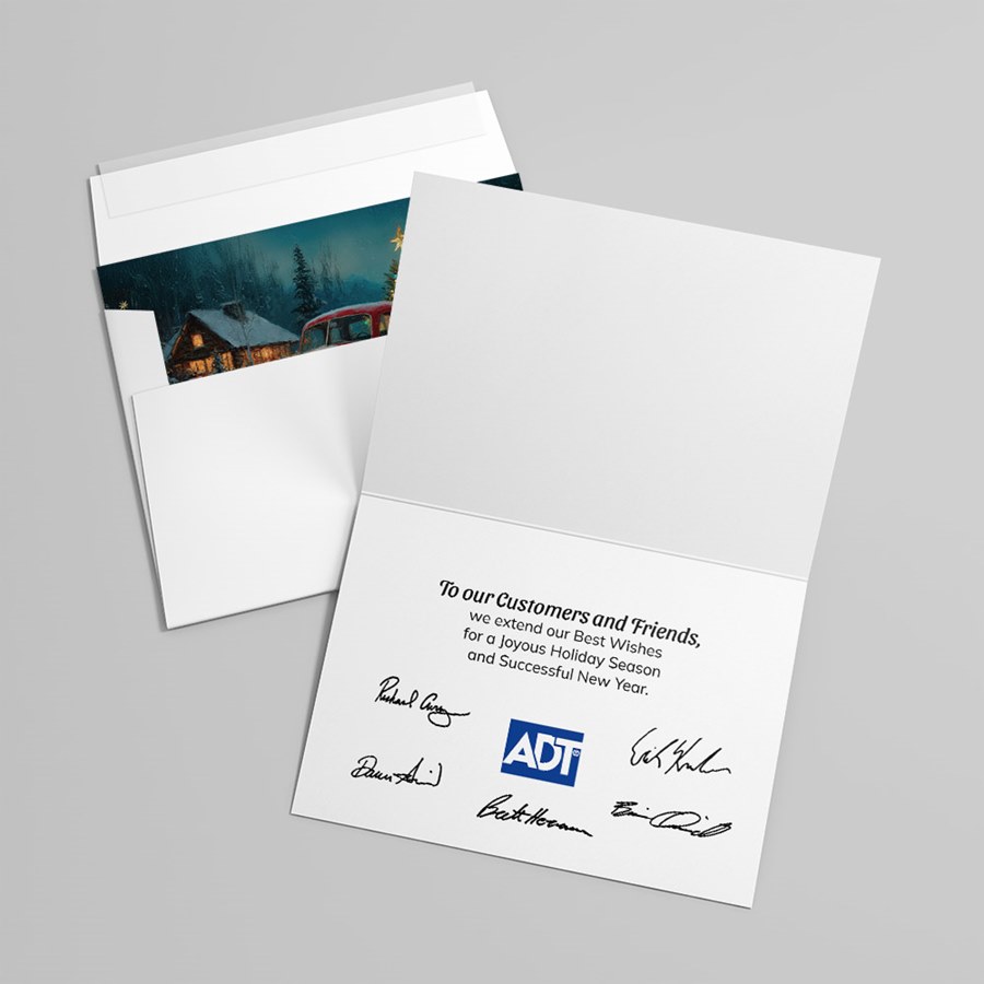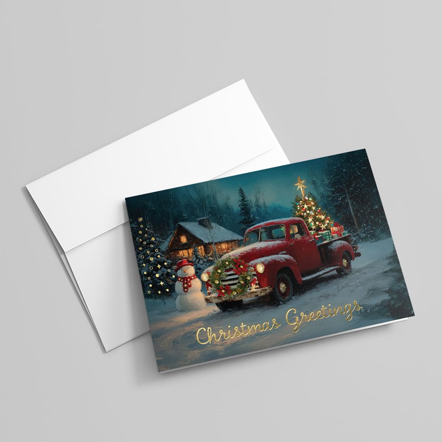 Send nostalgic holiday greetings with a vintage red truck adorned with a wreath, carrying a Christmas tree and gifts through a snowy landscape beside a cheerful snowman and pine trees, with a cozy cabin glowing in the background. Gold foil ornaments and the gold foil script "Christmas Greetings" on the front add festive shimmer, while the white interior offers space for your personalized message, verse, signatures, or logo. Coordinated envelopes are included.