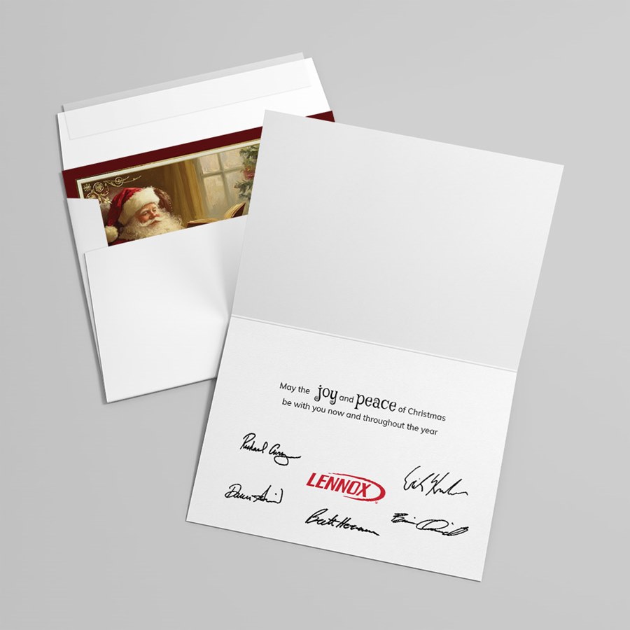 Bring a warm, traditional touch to your holiday greetings with a cozy storybook scene of Santa Claus reading by the window, surrounded by a decorated Christmas tree and ornaments, all framed by a rich burgundy border and ornate gold foil. "Merry Christmas" is printed in gold foil on the front, and the solid white interior is left blank for your custom verse, personalization, logo, or signatures. Coordinated envelopes are included.