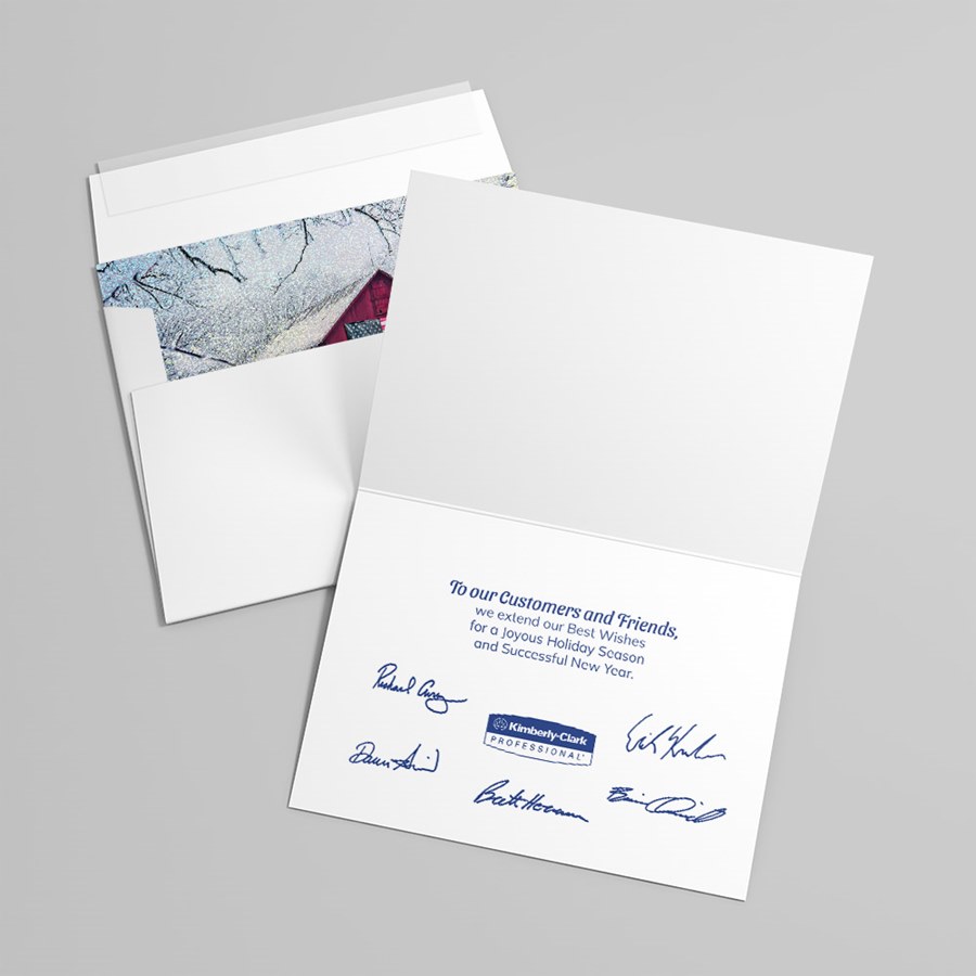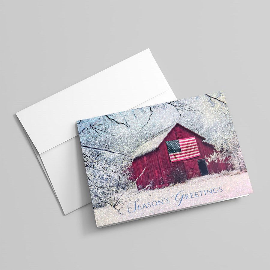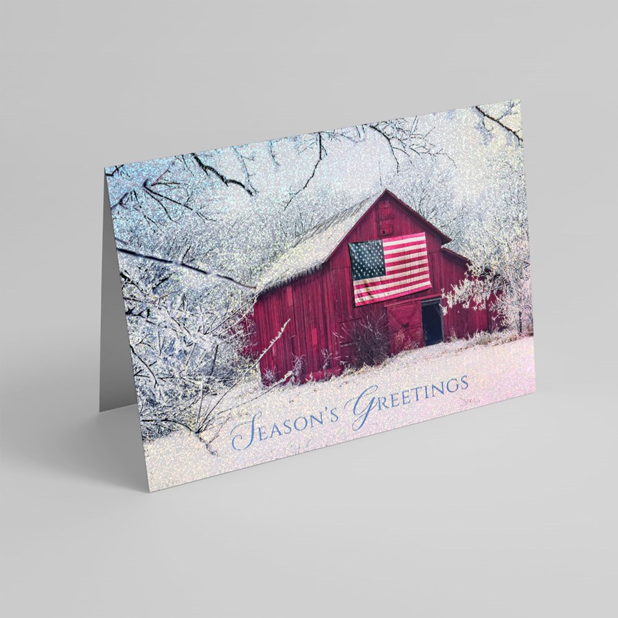 Send holiday greetings with a classic red barn set in a snowy landscape, highlighted by a clear glitter foil that enhances the snowflake effect and an American flag for a touch of quiet patriotism; the front reads "Season's Greetings" in elegant blue script. Each card comes with coordinated envelopes for a polished, professional presentation.